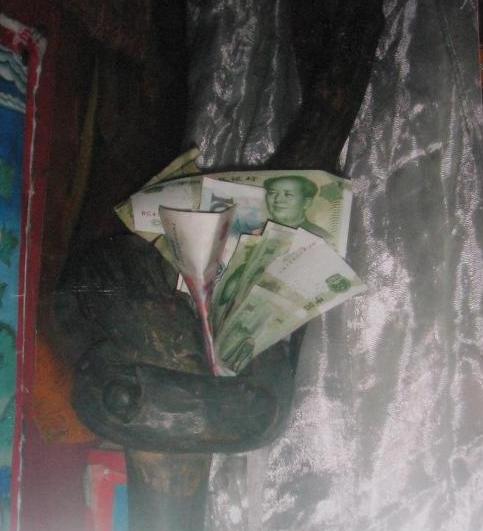 这张相片是03年喇荣五明佛学院的一位喇嘛给的。喇嘛叫索南,青海玉树人,是晋美彭措法王身边的一位工作人员,负责法王讲课时的音响事务。他说,相片中的这位僧人是他的弟弟,名叫扎嘉(记的不是太清楚了),是玉树当地的一位颇为出名的扎龙(藏传气功,修炼风,脉,明点)修行者,屡现神迹。比如能够腾空飞到三楼那么高,亚青寺的阿秋法王,见到扎嘉的时候也非常高兴,赞他扎龙修得好等等。这张照片是扎嘉一行人朝拜西藏某个神湖时拍下的,