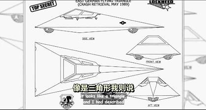 ⻢克:因为我的电脑遭到⿊客⼊侵所以我去到了⼀间⼩型⽹吧,来借⽤他们的电脑,当我正忙着查看电邮,在⼀旁我听到两个⼈之间的对话,他们在讨论铁磁流体——油基流体,因为它们内含铁⾦属所以其中有会对磁性产⽣反应的⾦属微粒,⽽他们在猜测这是否与推进系统有关,所以我就竖起了⽿朵稍微的专⼼在听,那个⼈提到某个载具的坠机事件,所以我就问你们俩在说什么?喔,我们不能公开讨论,我就说,好吧让我告诉你我所知道的,如果你觉得对你来说够有意思,你就告诉我你知道的东⻄,这个嘛这两⼈其中⼀⼈曾待过军队,他曾是某个刚成⽴的集团或单位的成员,⽽且该集团还未载⼊名册,后来我也发现他们就是⽤这种⽅式执⾏许多机密性⾏动,他们会先设⽴⼀个单位但在还未载⼊名册之前,还未成为历史记录的⼀部分,⼈们就已经在那个单位开始⼯作,他们会出去执⾏任务,然后之后这个单位才会去登记它的存在,但在那之前是完全⽆法通过《信息⾃由法》来索取信息,因为它还未正式存在,⽽这个单位就是这样操作的,就在冷战尾声正当苏联垮台,⽽且⼤家纷纷在谈论东⻄德的统⼀,当时有双重间谍——为美国情报局⼯作的⼈渗⼊了东德政府,⽽这位年轻⼈参与的任务,就是要渗⼊东德——以极低空⻜⾏⽅式秘密进⼊该区来接回某些在内部担任双重间谍的⼈,因为他们很担⼼⼀旦政府开始垮台,这些⼈可能会遭到谋杀,⽽他们在任务进⾏到⼀半——正要去会合点来接其中⼀位⼈⼠——他们这时就接到指令要求转往这个坠机地点,这个交通⼯具本⾝我并不知道它的名称,但我可以跟你形容它的样⼦,想象⼀下有⼀个很⼤的⿊⾊箭头,⽐较钝的那⼀端在这⾥,⽽尖锐的那⼀端在那⾥,可是当它在空中⻜⾏,钝的那⼀端是朝向前⽅的,它的驾驶座舱⻓得很像F-117A隐形战⽃机的座舱,在窗户四周有锯⻮状边缘,其顶罩的边缘也有朝向⻜⾏器⾥⾯的锯⻮状图案,如果迎⾯来看它看起来像个三⾓形,从侧边看就好像其中⼀⾓被往外拉的⾦字塔,在前⽅每个⾓落底下有⼤约直径2.5——或⼤概24⾄30英⼨的⽩⾊球体嵌⼊在载具机体,前⽅的每个⾓落⾥⾯,⽽且在⼤约后⽅三分之⼆之处,在⻓⻓的尖端位置,安装了第三个球体,这些球体是由三个⽖⼦扣紧的,就好像戒指镶的珍珠⼀样这个⽖⼦是银⾊的看起来好像可以移动并指向不同⽅向,也许是⽤来操纵载具的,等他抵达现场要进⾏收拾残局的⾏动,有⼏位⾝穿⽩⼤⾐全副武装的技术⼈员,把座舱重要的零件搬出来,他们把零件移出,要带到他处,这个载具的⻜⾏员因为使⽤这个系统,以低空⻜⾏⽅式执⾏某种监视⾏动⽽坠机,它失事地点是在东德距离⼀个名叫哈雷的城市,⼤约10公⾥的⼭⾕,他⻜过⼀个⼭脉,⽽载具左前⾓斜撞到⼀棵⼤的松树,整个⾓落都被削掉了,⽽且把那个⾓落的球体压碎,那个载具⻢上从左侧往下坠,因为它在推进机制的位置,失去了⽀撑,为了避免坠机,他试着尽可能往右斜侧⻜⾏,然后把⻜机头拉起来,但它还是撞上了⼭丘,它是先撞击到机尾,在撞上的时候,机⾝的结构因此裂开,那⾥就是嵌有第三个球体的细⻓尖端处,那个球体开始飘⾛,⽽且在他们抵达时仍在⼭丘附近飘来飘去,⽽且那个三⽖的固定器也已脱落,但是球体本⾝⼤部分完好⽆缺,他形容这个物体看起来像⼀个⽩⾊陶瓷的南⽠,并拥有南⽠看得到的那种直线条纹,但是每根条纹,都有像扇⻉状的凸起纹路⼏乎有点像是传教⼠⻛格建筑的⾚⼟⽡⽚,它的形状看起来像是为了要在船舰内部产⽣流动状态⽽设计,在最上⽅的部分是⾦属⾊的通电载体,其颜⾊就像是画笔刷过的铝合⾦⾊,⽽且有好⼏条电线跑出来,他形容这个东⻄离地⾯⼏英尺的距离,在飘来飘去,⽽且每过⼀阵⼦,这个球体就会迅速地旋转并同时上上下下的跳动,⽽且它会移到离地⽐较⾼的地⽅,⽽且在跑出来的⼏条电线之间,会有电流通过,然后它⼜会稍微镇定下来,所以他们的任务是要捕捉这个球体,⽽这个物体过⼀段时间,就会以充满活⼒的⽅式跳舞,所以他们得计时,并等到球体安定下来的时候捕捉起来,他们带着⼀个军队⼀贯使⽤的⼤型的铝质⻩⾊箱⼦,⼀侧有着琴式铰链,另⼀侧则有螺丝扣,这种扣⼦⼀旦关起来就可以锁很紧,当他们拿着这个箱⼦像这样⼦靠近它,⽽箱⼦的铝合⾦会明显地反射出这个物体产⽣的磁场,所以当他们靠近球体时,球体就会飘⾛,与铝合⾦互相排斥,他们想了⼀个办法,他们把琴式铰链拆开把扣针拿掉,来移除箱⼦的盖⼦,他们将盖⼦滑到球体的底下,然后把箱⼦的下半部,拿到球体上⽅把铰链系上关上螺丝扣,然后把⼿移开,结果箱⼦就…,像墓碑⼀样的⽴了起来,根据他们的描述是蛮吓⼈的,但是他们找来了——这真的很难以置信——,他们找来了⼀架CH53超级海种⻢式直升机,并以⾄少⼀百英尺⻓的合成系绳来钩着这个箱⼦,⽽因为其产⽣的磁场太过强⼤,他们担⼼这会扰乱直升机的航空电⼦技术,所以他们就赶快离开了,⾝穿⽔兵短⼤⾐及守夜⼈帽⼦的海豹特遣队也在现场,他们拿着M16步枪,和⽴式榴弹发射器,他们派遣了两架备有导弹⽽且全副武装的眼镜蛇直升机在现