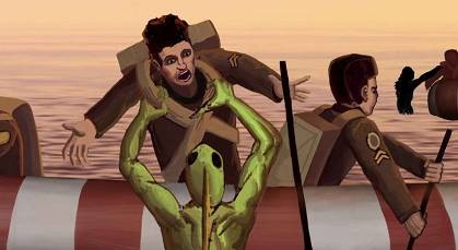 科⾥:我在⾻⼦⾥感觉到⼀点恐怖。其实有很多奇怪外表的⽣物。所以,不要存在偏⻅——我的意思是,因为我感到并不对劲。我俯⾝向冈萨雷斯。我问他,这⽔⽣物会否给你带来⽑⾻悚然的感觉呢?然后他停了下来,把⼿伸进外套⾥,拿出⼀个智能玻璃平板。坐在那⾥,查看了⼀会⼉,然后把它交给我。我拿着它,然后看着显⽰的内容。这是⼀个报告,在韩战时期,⼀架轰炸机在执⾏⽇常任务时,发⽣机件故障,最终坠落在海上。但是,坠机着陆是成功的,