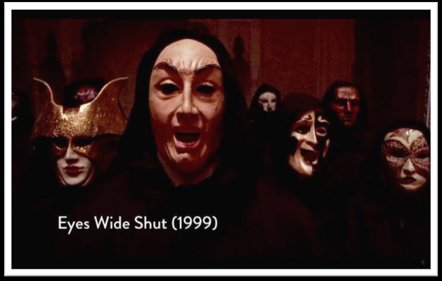 ⼤卫:当你看《⼤开眼戒》这种怪异⽚,或是描述其他阴谋团体密会,戴著⾯具,有各种⻜禽的⾯具,表⽰他们现在是⼈形,但还是⻦头。你觉得这些⻦兽⾯具跟过去拜访我们的外星⼈有关?(1999年《⼤开眼戒》)