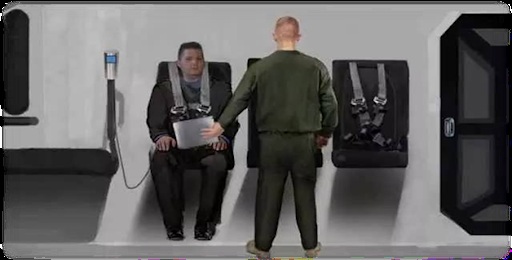 科⾥:我就记得我正朝⻜⾏器的滑梯⾛,看起来像⻜⾏器的前端。让我想起了隐形⻜船,就是海军拥有的棱形⻜船。我只记得我⾛向滑梯,但不记得我上了滑梯。然后,我记得我坐在了⻜船内的折叠椅上,且被吊带绑著。