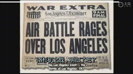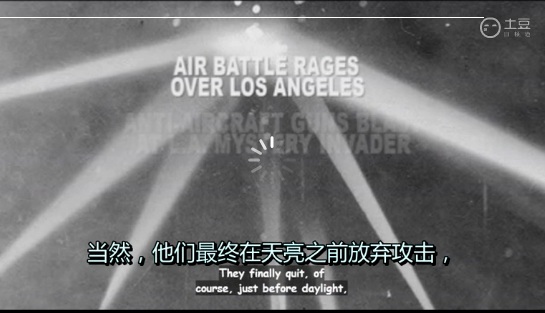 威廉•汤普⾦斯:那是在1942年2⽉,我们当时住在⼀栋⾮常宽敞的住宅⾥,住宅被改建成四套公寓,两套位于楼上,两套位于楼下。有个⾮常巨⼤的露天平台贯穿了这栋天花板⾮常⾼的建筑。我们距离海边有四个街区,明⽩吗?我们看不到海洋,因为它位于低处。中间有树⽊挡著。当时,我的哥哥和我正躺在家中的地板上听收⾳机和看报纸。我⽗亲说,出去,到露天平台上去。⻢上从家⾥出去。于是我们站起⾝,⾛到后⾯的露天平台上。就在所有树⽊和建筑构成的地平线上⽅,有⼀个点,⼀个⽩⾊的点。它就在那⾥。那肯定是某种⻜⾏器要⻜过来并降落在空军基地。但是它⼀动不动。看上去只是个明亮的圆点。⽽这个点的左边是⼀道笔形波束。但你可以看到它。它出现在远处的海洋上⽅,或许在防波堤内。但由于我们看不到海洋。我们也不清楚那究竟有多远。可能是10英⾥外。那到底是什么?我们观看了⼤概5分钟,然后出现了⼀道闪光—⼀道耀眼的闪光射⼊我们眼中。闪光照亮了树⽊、照亮了后⽅和侧⾯—⼀切都被照亮了。然后,闪光熄灭。我们继续看了⼜看,⼀切都消失了—什么都没有了。于是,我们就上床睡觉。半夜12:30,⾼射炮开始射击。我们所说的正是奇妙的洛杉矶事件—洛杉矶之战,