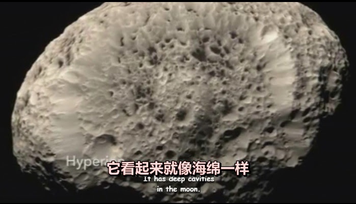 萨丁:所以这些信息更新⼀些,他给我描述说有超过60个卫星,围绕在⼟星系周围,如果你越过我们通常听说的卫星,就会有更⼤的卫星那⾥有⼤⽓层,或许多地质状况你会发现很多畸形的卫星,在那⾥类似于⼩⾏星,有⼀个很特别,这颗卫星的名字叫做Hyperion,它上⾯有很多很深的空洞,它看起来就像海绵⼀样。
