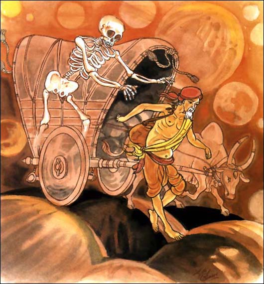 一切苦难追随行恶之徒,有如挽车的牛,车轮随足蹄。