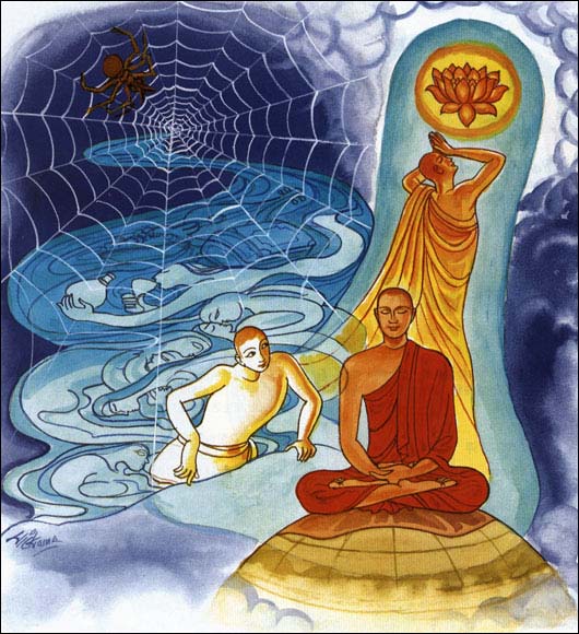 蜘蛛受困于自己所织的网中,智者断除一切苦,舍弃爱欲。
