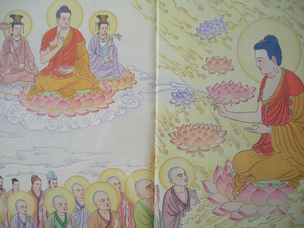“又舍利弗!佛陀加重语气说:‘大众要注意听!凡是因为念佛而往生到极乐世界的众生,就永远不会退转其信愿而堕落于六道中,而且常游诸佛清净世界,效法诸佛的殊胜行愿,正念增进,将来决定必证佛位。现在极乐世界的众生中,就有许多已经修到只要一生即可补佛位的大菩萨,这种即将成佛的大菩萨,在极乐世界里的数量多得无法计算。”