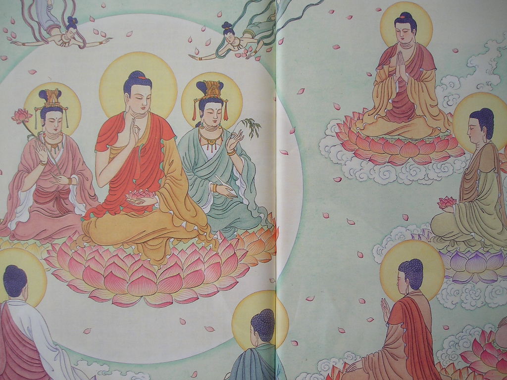 舍利弗!北方世界亦有焰肩佛、最胜音佛、难沮佛、日生佛、网明佛,如是等恒河沙数诸佛,各于其国示现广长舌相,诚实地教化三千大千世界的众生说:‘你们应当深信受持这部称赞阿弥陀佛极乐世界不可思议的功德庄严,并且为十方三世一切诸佛所摄受护念的阿弥陀经。’