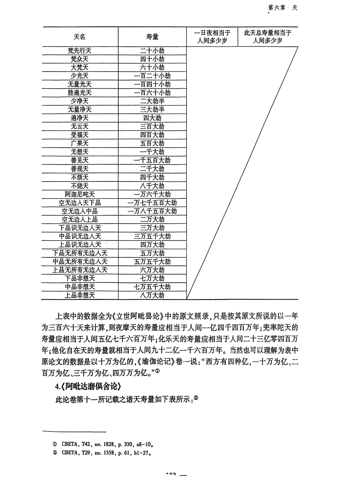 | 无所有处天 | 寿命6万大劫 | 空色既亡,识心都灭。十方寂然,回无攸往。如是一类,名无所有处。 | ||