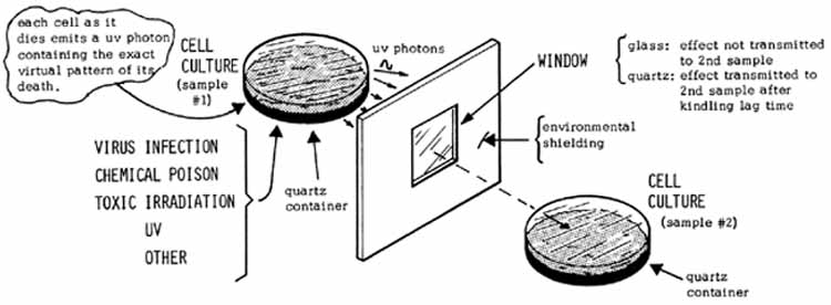20世纪20年代,A.G. Gurvitsch的研究表明,细胞能释放出可导致有丝分裂的辐射(光子),从而影响到其它细胞。20世纪60年代,Popp(波普)等人证明了这通常被称作"生物光子(biophotons)"的超微弱光发射[06]。遵循这些发现,Kaznacheyev研究小组通过寻找受感染细胞发出的光子(photons)来探求答案。他们发现,受感染的细胞在死亡时释放出近紫外光子(photons in the near ultraviolet)。