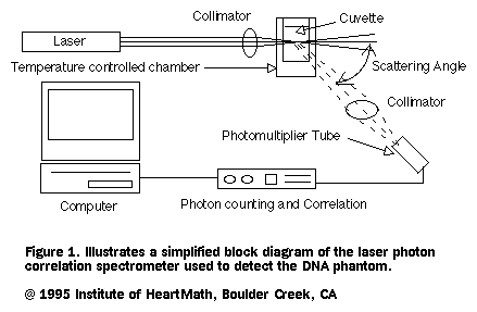 DNA幻影效应,最初是俄罗斯科学院使用激光光子相关光谱仪(laser photon correlation spectrometer, LPCS)测量溶液中DNA的振动模式时发现的。伽利耶夫(Peter Gariaev)和琶普宁(Vladimir Poponin)对此进行了分析和解释。1995年,Poponin发表了关于此实验的研究论文。实验中用到的激光光子相关光谱仪装置原理:用激光器(Laser)作为光源,照射到盛有DNA的样品池(Temperature controlled chamber or Scatter chamber)内;光电倍增管(Photomutiplier)作为光探测器用以测量散射光信号,数字相关器(Photon counting & Correlation)对光电倍增管输出的脉冲信号进行计数,并计算自相关函数送入计算机。