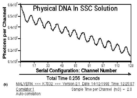 DNA物质放置在散射室时,散射光显示了一个典型的时间自相关函数如图b所示,是一个振荡的、慢慢地呈指数衰减的函数。