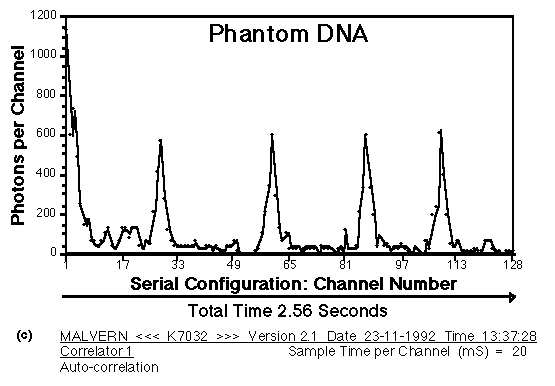 DNA物质从散射室取出时,预计自相关函数会和DNA物质放入散射室之前时的相同,即如图a那样。令人惊讶的,DNA物质放入前和取出后的自相关函数明显不同,如图c所示。