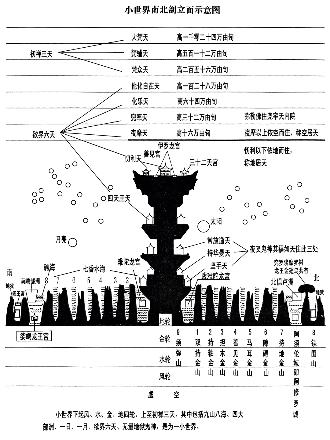 日月围绕着须弥山运转,日月照临的范围,即以须弥山为中心的四大洲,名为一小世界(包括地狱、天等领域)我们地球处于四大洲的南瞻部洲。如下一小世界图(来自或整理自香港版《大方广佛华严经》):