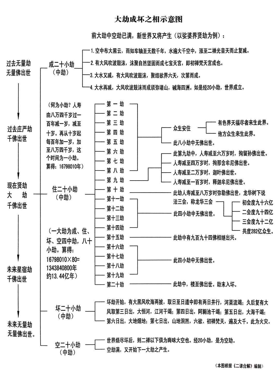 | 一大劫 | 丁福保《佛学大辞典》中解释大劫:谓成、住、坏、空之四期为一周,为八十增减之时量。旧译称之为四中劫,新译称之为八十中劫。 陈义孝《佛学常见辞汇》中解释一大劫:历成、住、坏、空四个中劫,为一大劫,一大劫共有13.4384亿年,为一世界由成至毁的年数。如下图示。