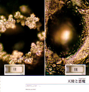 左图:水读了文字“爱和感谢”后拍下的水结晶照片。 右图:让水读了“真恶心讨厌,我要杀了你”所拍的照片。
