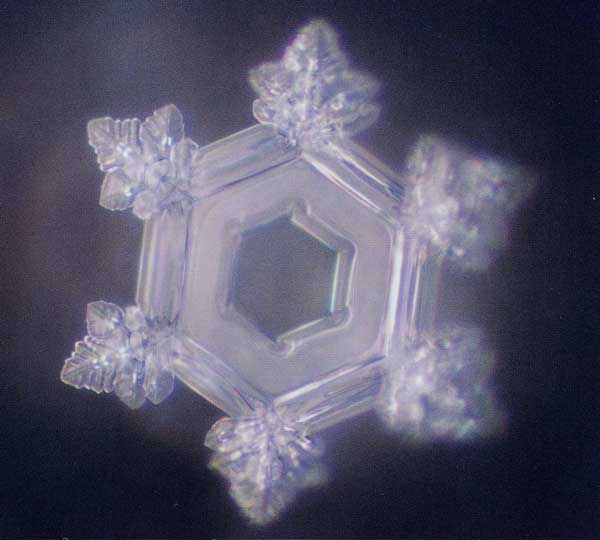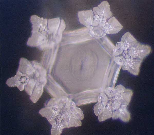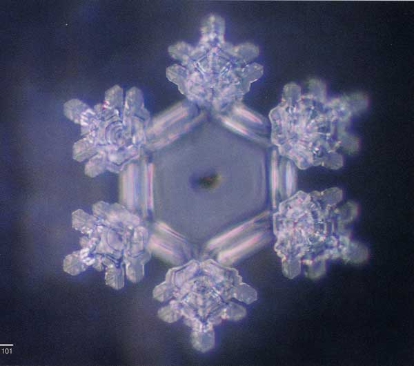 这幅结晶图出自“三分泉”的水(图1) 。“三分泉”在日本山梨县北巨摩郡。泉水在某一处分为三路,故名“三分泉”。这个结晶的每个角也有三个分支。