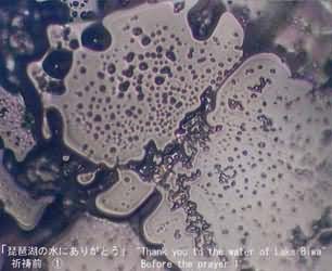 将优美的风景或祝福字句放在水的前面,结晶变得漂亮。将诅咒的字句放在水的前面,水变得扭曲丑陋。