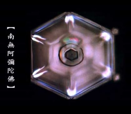 看到‘谢谢’字样的水,结晶呈现出美丽的六角型,相反,看到‘混蛋’字样的水,结晶亦是像听过重金属乐曲一样的混沌零散;