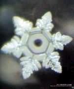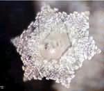 这是听了萧邦的「离别曲」的水结晶照片。图片报告说:没有比得到这张水结晶时更令人感到吃惊的了。摄制这张照片的显微镜的倍数与其他照片是一样的,但是「离别」的曲调竟让基本形状的水结晶被完整地分化得更小,成为地地道道的离别模样。