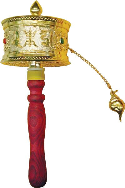手转经轮,就是我们手里经常用的这种。它的式样,以前上师如意宝专门设计过,并叫工厂大量制作了几种。你们在使用时,一定要注意里面的藏文不能颠倒,观音心咒的字应该完好无损,否则过失比较大。请了转经轮之后,若有一位具相上师对其开光,加持力会更大。当然,若条件不具足、因缘不具足,没有开光的转经轮也可以使用。