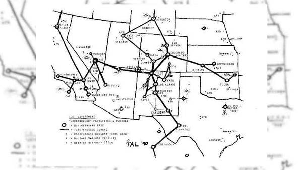 ⼤卫:那么现在我们来看⼀看菲尔•施耐德⼿绘的美国地图,这个地图上显⽰了⼀系列圆形代表地下基地,然后是⼀系列代表隧道系统的线条。