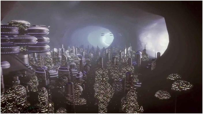 科⾥:呃,我什么都看不到,因为它就像是有⼈在我的脑袋旁边,开动⼀块巨形电磁铁,我意识到这个,我的意思是说,我有点晕眩,倒在旁边,但当我们穿越了它,我就⻢上清醒过来。这就像是某种影响我意识的壁垒。我可以看到⾥⾯是个巨形球体上附着所有城市。建筑物的顶部都是朝向球体的中⼼点的。