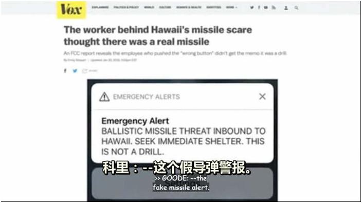 科⾥:——这个假导弹警报。但是如果你看更深的新闻,你看到⼀些有趣的东⻄:UFO被报道接近夏威夷,在那段时间内,天空中出现怪诞的电晕现象。还有,有⼈报道爆炸。在天空中,可能是⼀颗流星。嗯……