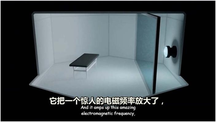⽽在按摩椅后⾯三英尺,有⼀道三英⼨厚的有机玻璃墙。后⾯是⼀个巨⼤的特斯拉装置,它把⼀个惊⼈的电磁频率放⼤了,它把时间和空间分开了。零点能量装置的很多副作⽤造成这些效果。很多科学家,包括特斯拉,都⽬睹了这⼀切并记下来,出现⼀个场域,⼀个圆球型的范围,也发⽣过在我的实验室⾥,在那⾥有⼀刻,时间会被扭曲了。