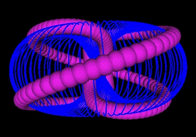 这个动画显⽰⼀个旋转的圆环⾯的外场,这是分形或嵌⼊式逆旋转两个反向旋转的圆环的动画