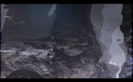 科⾥:是的。但四处⾛动的这些⼈并没有戴著护⾝符。当我们沿著洞⽳墙壁边缘⾛的时候,我们看⻅城市全貌的⼀⼩部分。圆顶⾥⾯有些建筑,椭圆形的顶好像⾃⾝就会发出某种⽩光。很多建筑都是岩⽯打造,就像是从⽯头模⼦⾥刻出来。我们浏览四处…冈萨雷斯⼜撞了我⼀下,我⼀抬头,看到许多⻜⾏器在⾥⾯⻜⾏。就像是1950年代的电影。有经典的⻜碟造型,⼤型雪茄和蛋形…极似鸡蛋形状的⻜⾏器。