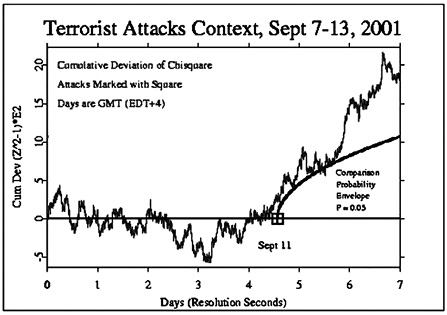 在1997年晚期,他们开始建立一个7×24小时运作的全球性网络,来寻找这样的模式。所有数据都通过互联网传输到普林斯顿大学的一个核心位置进行分析。到了2001年,全球意识项目已经扩展到运用位于世界各地的37台电脑来全天候收集数据的规模。当9·11事件刚发生并且新闻报道开始传播到全世界时,他们获得了实验结果。
