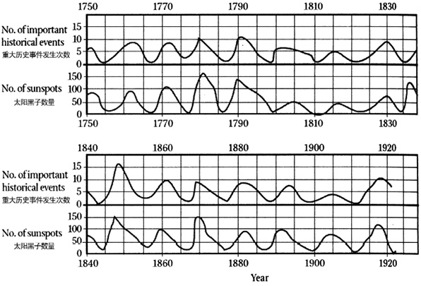 因特•A.L.柴可夫斯基(Enter A.L Tchijevsky)是20世纪早期的俄国科学家。柴可夫斯基创造了“群体性人类兴奋度索引”(Index of Mass Human Excitability)来研究72个不同国家的混乱和骚动事件,研究的时间跨度达到2500年,从公元前500年到公元1922年。他寻找人类不开心时那些显著的标志,比如战争、革命、骚乱、经济低迷、远征和移民。同时依据牵涉人群的数量来对事件的严重程度进行分级。出乎他的意料,柴可夫斯基发现80%的重大事件都发生在太阳黑子活动最活跃的5年中。太阳黑子的活动并不严格遵循11年的活动周期 , 有时候来得早些,有时候晚些。然而,最负面事件中的80%都是在太阳活动达到最大强度期间发生的。