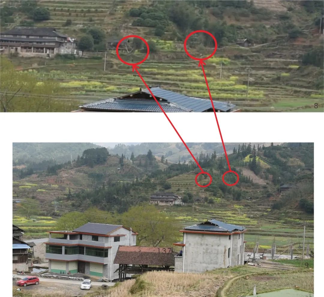图片:红圈中间是两名本村村民,因太远,在普通人眼裡已无法看出任何细节。吴永菊的神奇视力,可能与她上一世是鹰有关。(注:上图是下图的放大。)