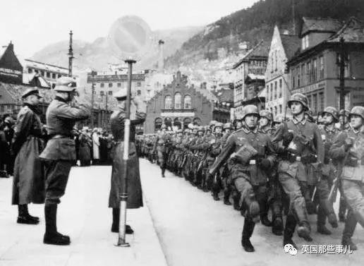 或者是和一排排身穿制服的军人一同站在大厅里,墙上挂着希特勒的画像,