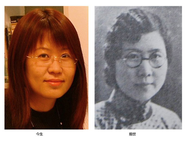 左边前世照片,女校的图书馆管理员;右边今生照片,某部门经理。