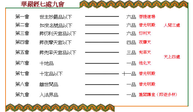 湛智海之澄波,虚含万象;皎性空之满月,顿落百川。不起树王,罗七处于法界;无违后际,畅九会于初成。尽宏廓之幽宗,被难思之海会。圆音落落,该十剎而顿周;主伴重重,极十方而齐唱。