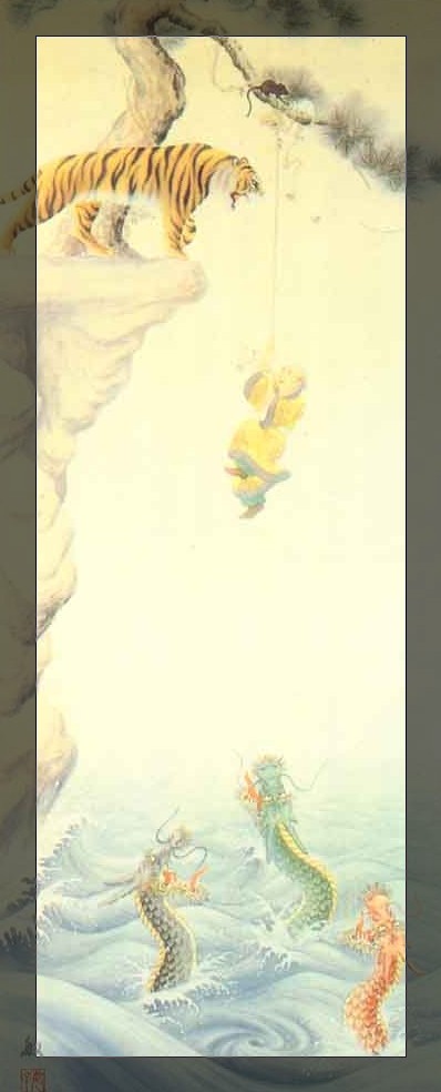 很久很久以前,有一个人在旷野中游走,被一头凶恶的大象所追逐。游人惊慌失措,不知如何是好,恰好看到一个空井,井旁有一颗大树,游人赶紧抓攀着树根,藏身到井中。有黑白两只老鼠,正在啃噬着树根。井的四边有四条毒蛇吐着舌头,井底有一条毒龙正在向上张望。游人心中畏惧毒蛇和毒龙,又担忧树根被老鼠咬断。就在这个时候,从树上的蜜蜂窝中滴下五滴香甜的蜂蜜,不偏不倚地落入了游人的嘴中。游人顿时忘记了刚才的恐惧和担忧,尽情地品尝起蜂蜜来。由于树身晃动,四散的蜜蜂飞下来刺蛰游人。不知从哪里来的一团野火,烧着了这颗大树。