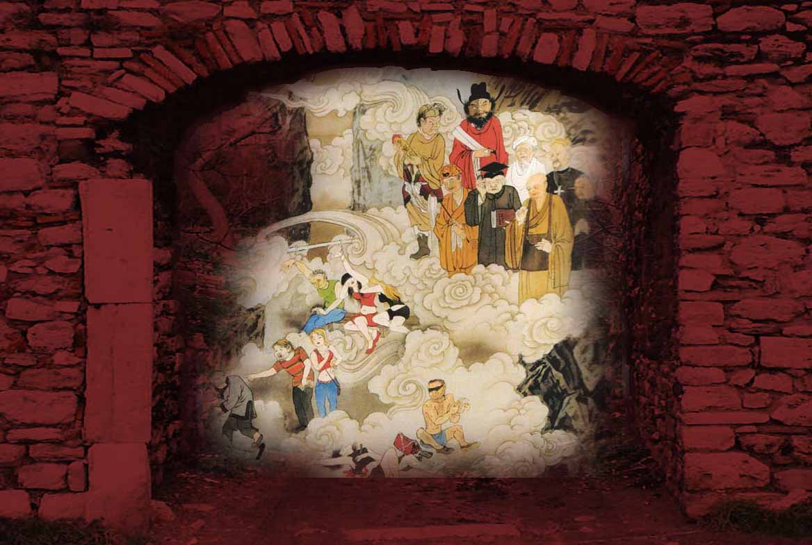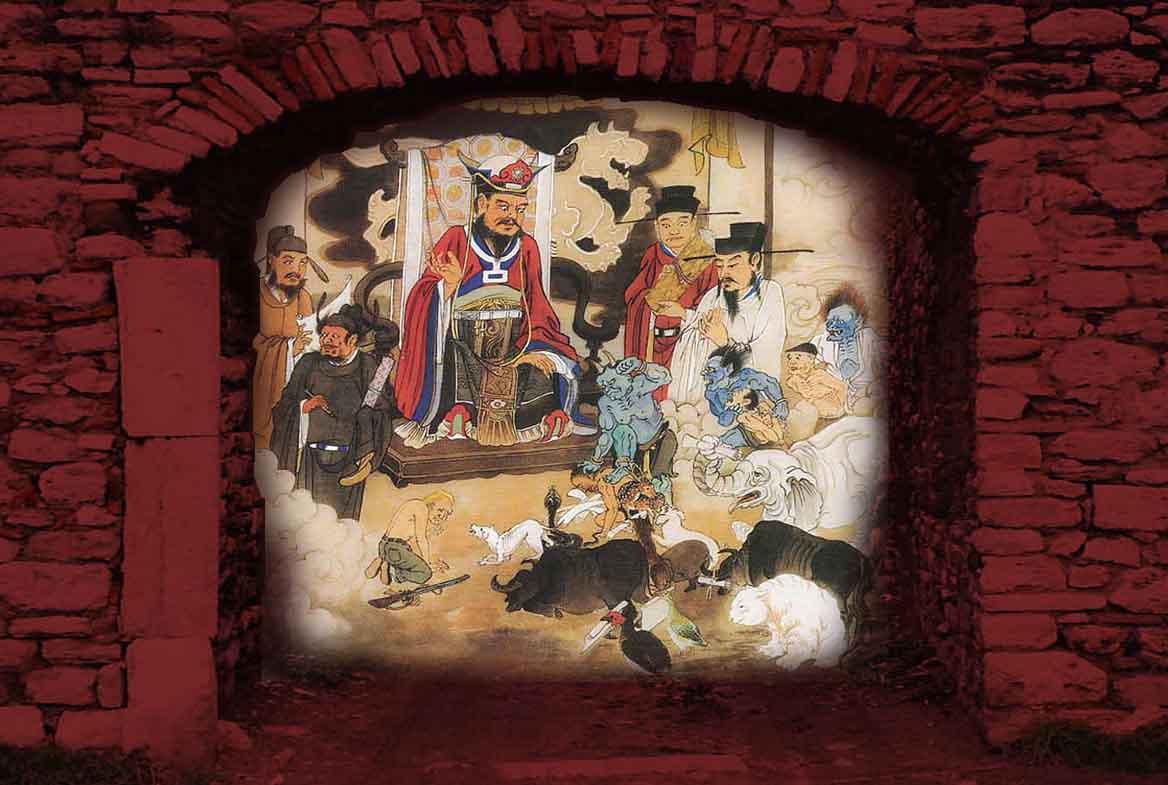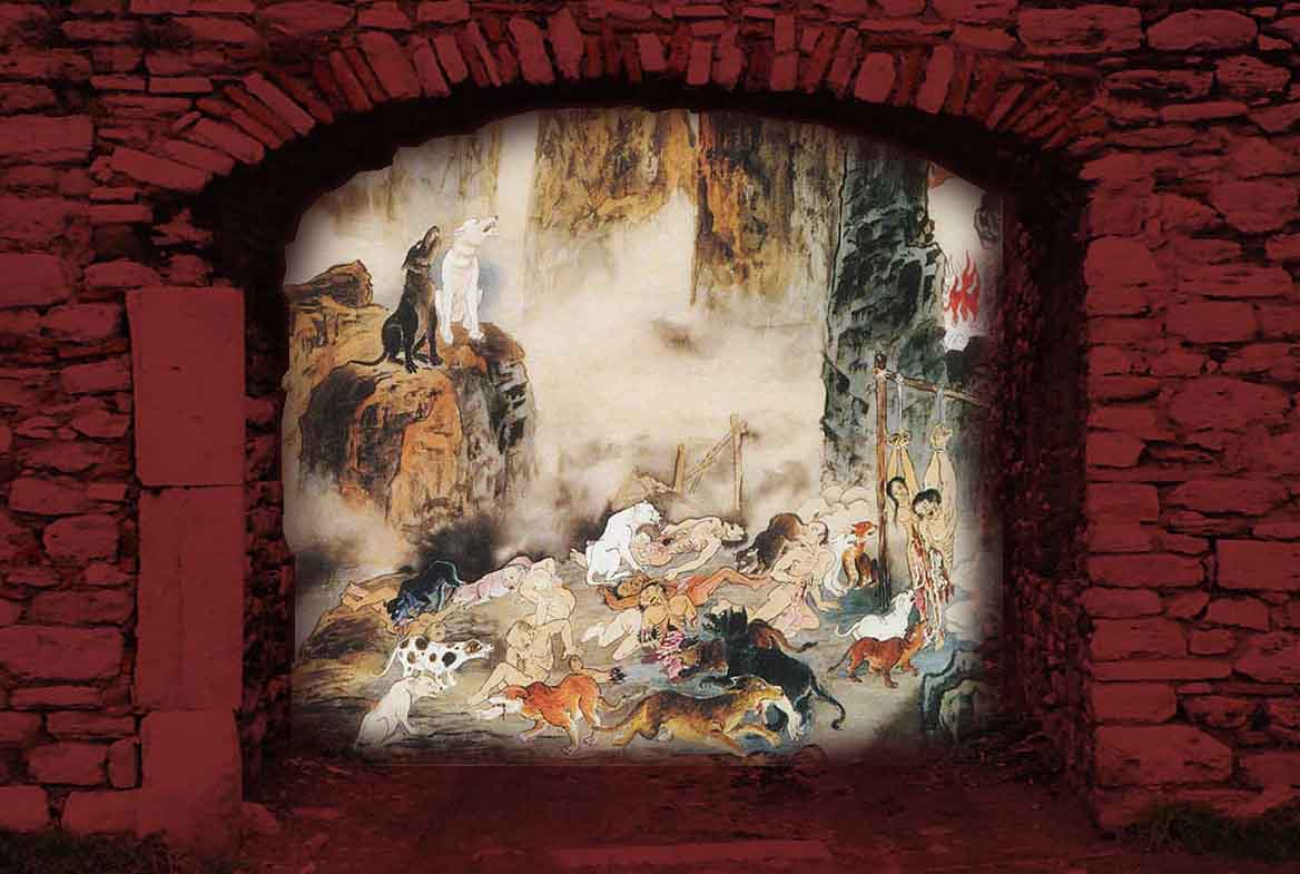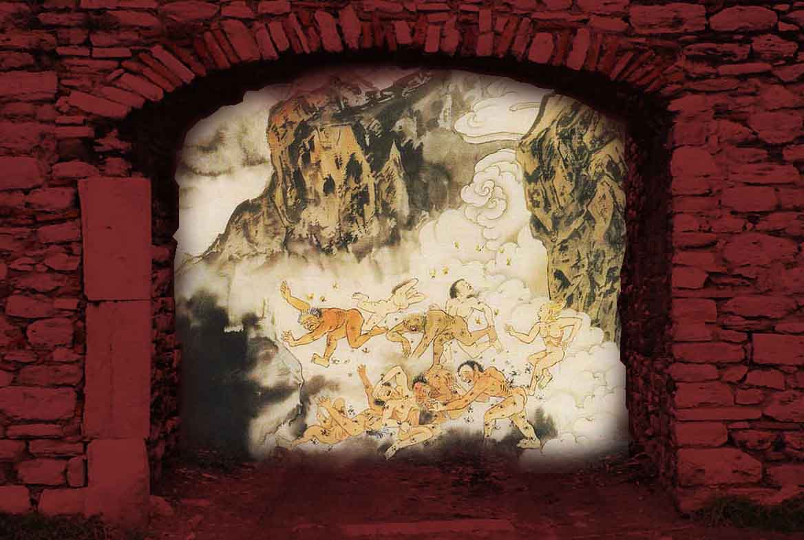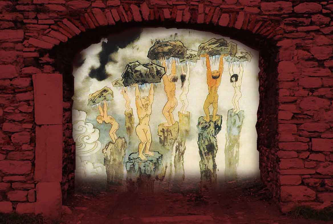 迷朦光中,幾個青面差使,押解一批罪犯,在寒鐵山洞穴中穿梭而過。這批罪犯,個個衣冠楚楚,看得出其生前之顯赫與榮耀,從服飾穿著來看,有不同的階級與地位;有的應該是政客,有的應是掌有權位的學者,在他們的神色之間,依然殘留幾分得意與跋扈。孱雜人群中也有宗教人士、神職道侶,享盡人間一切福報,辜負眾生之供養。此時個個神情凝重,似乎已嗅到「大事不妙」的氣息。