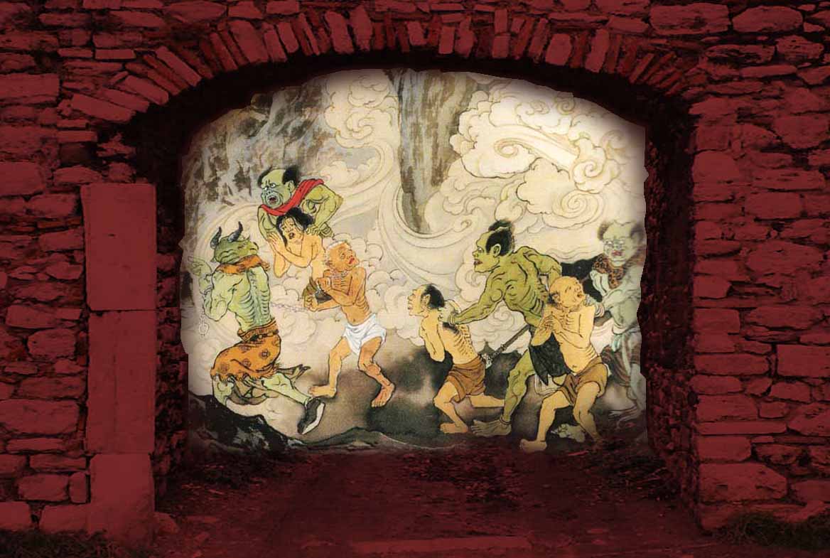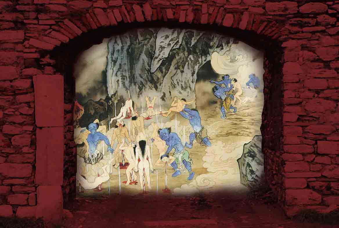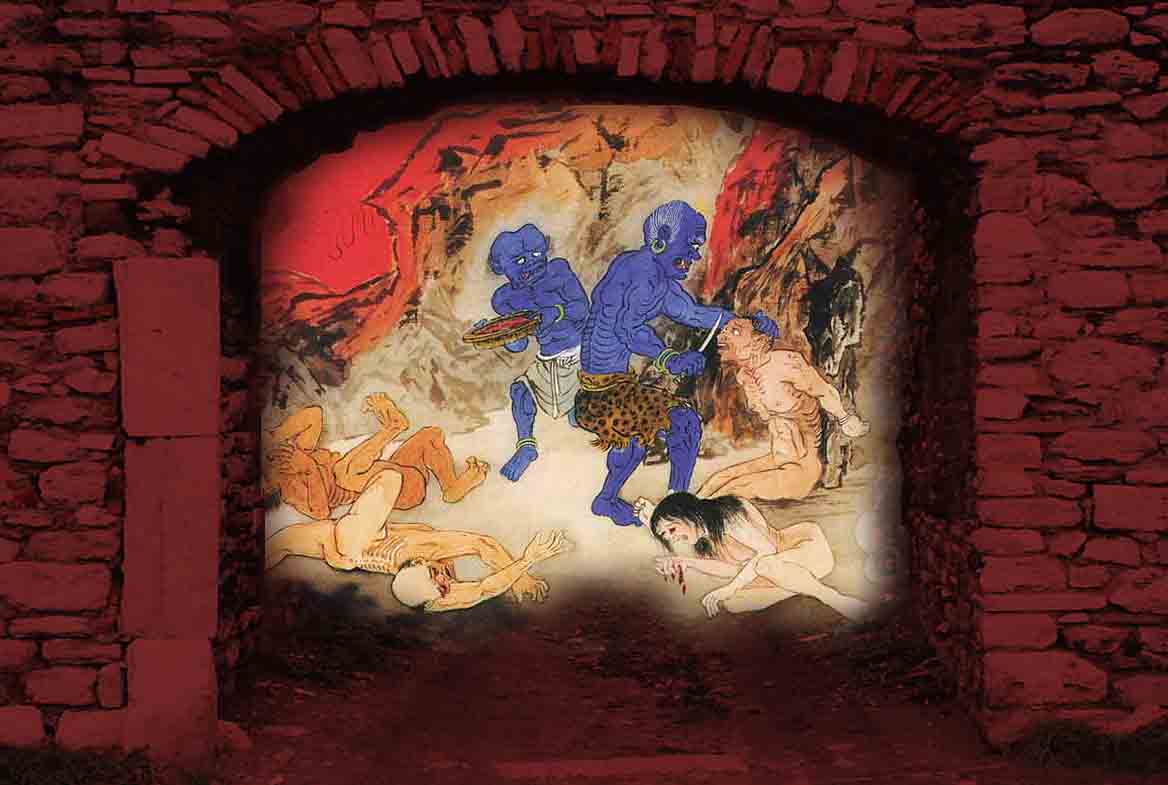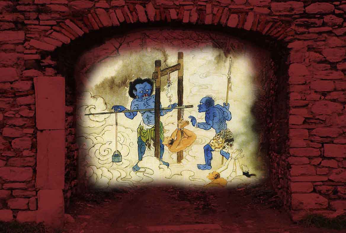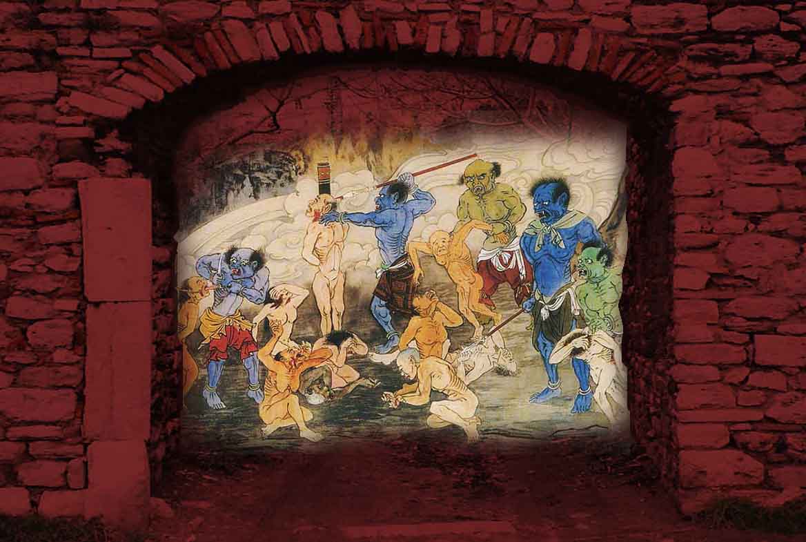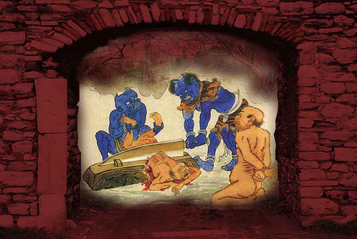 地獄之中,隨時可見成千上萬夜叉厲鬼,血口鋼牙,眼如電光,利爪如鋼鐵,箝制罪犯,押解拖曳至各大小地獄。