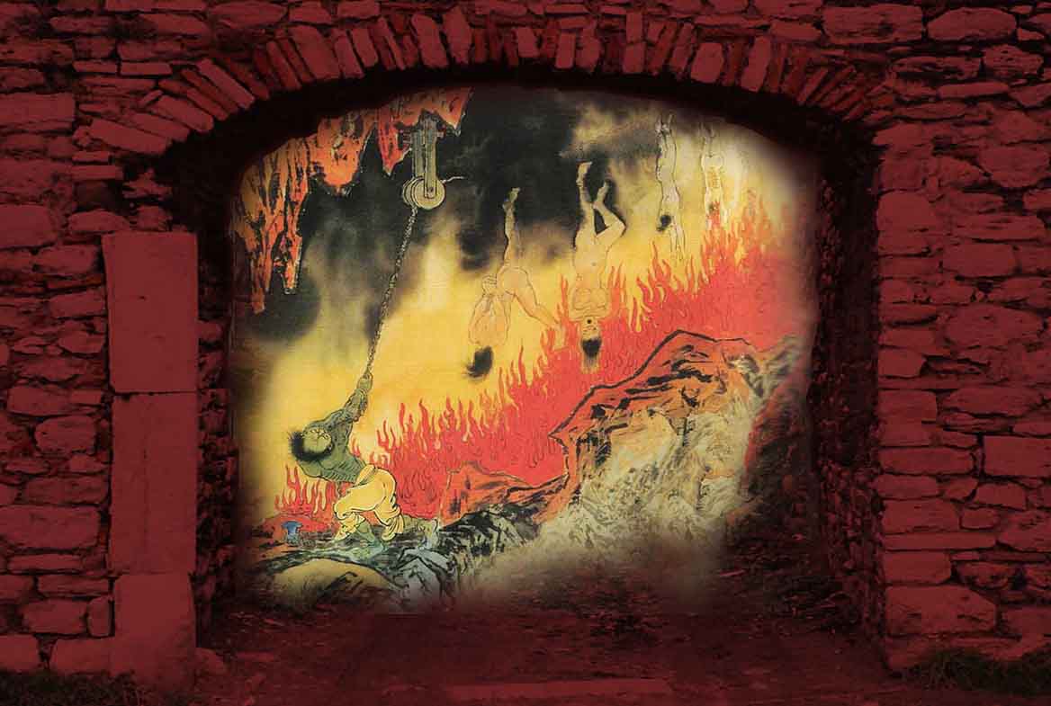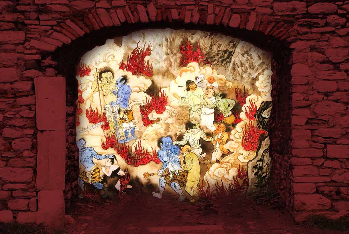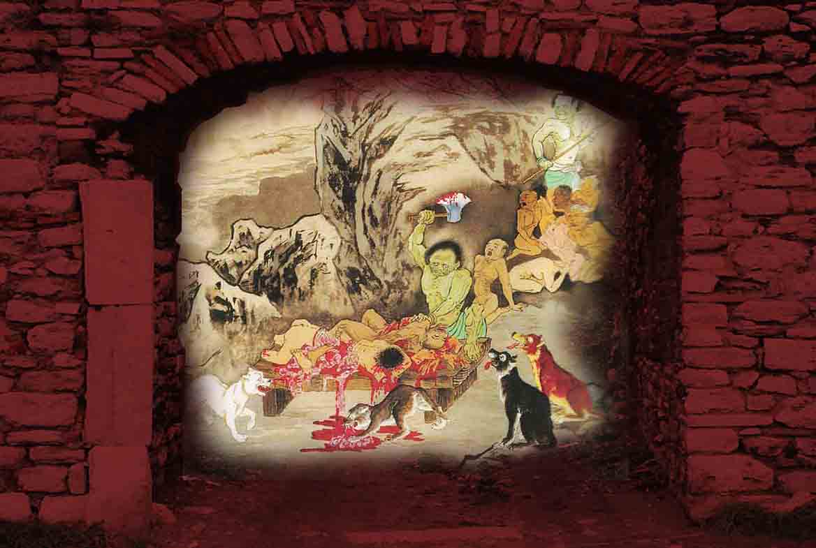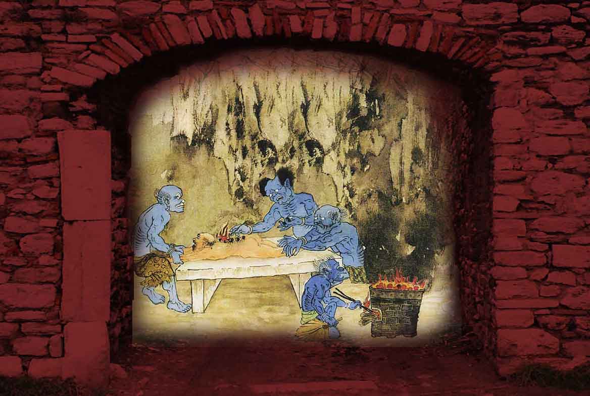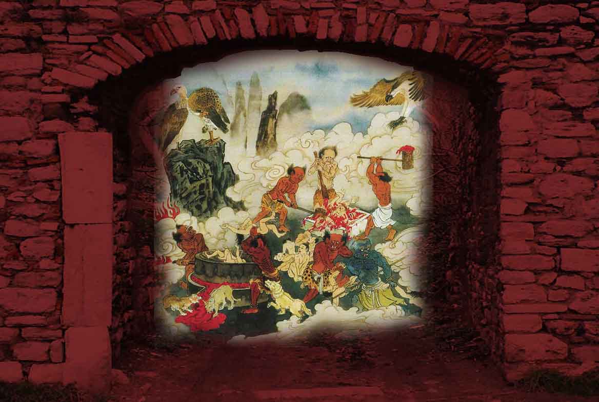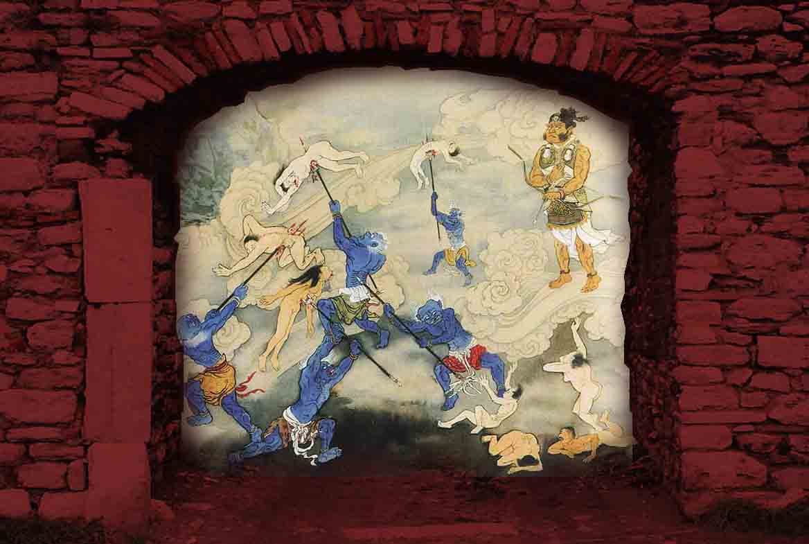 地獄之中,隨時可見成千上萬夜叉厲鬼,血口鋼牙,眼如電光,利爪如鋼鐵,箝制罪犯,押解拖曳至各大小地獄。