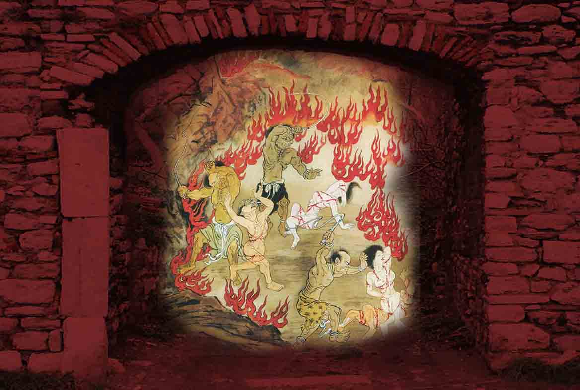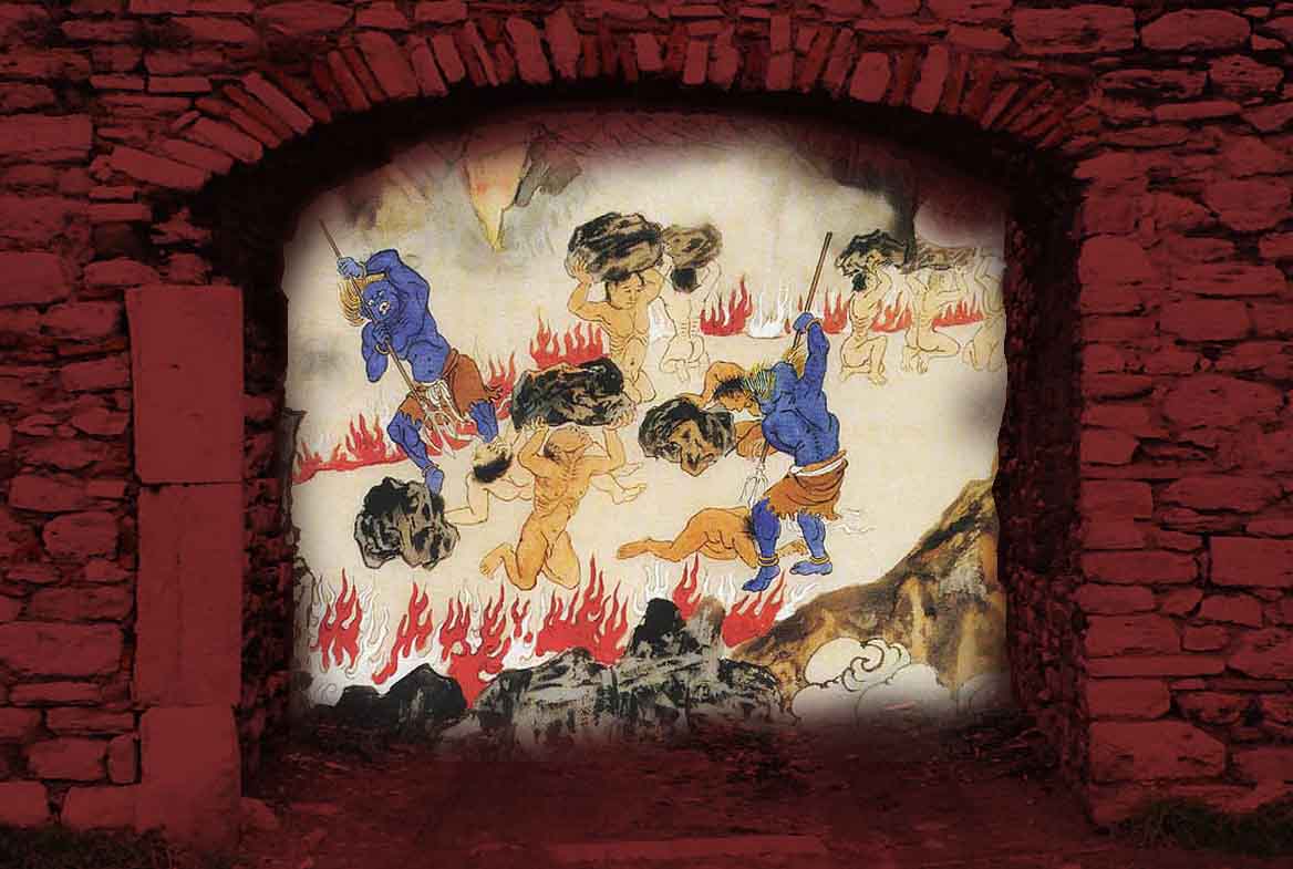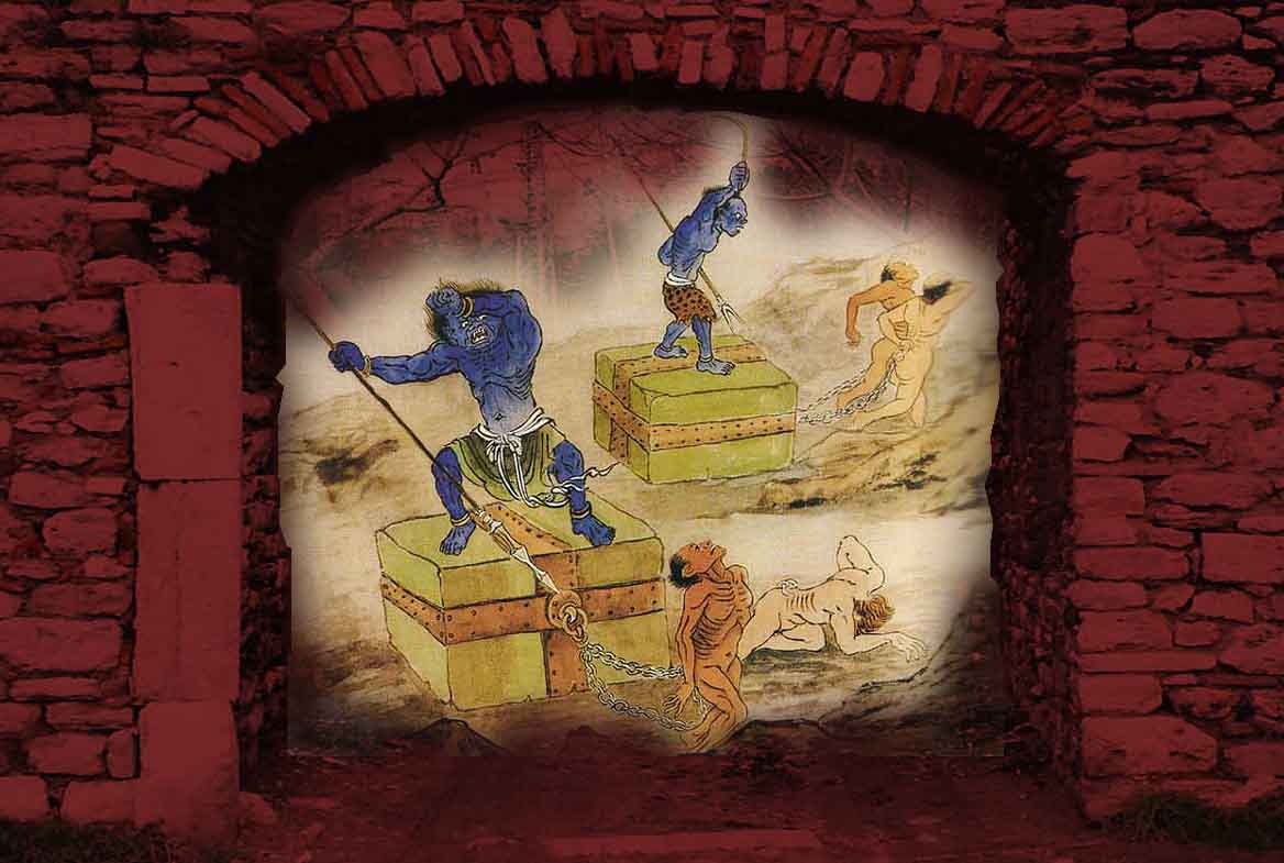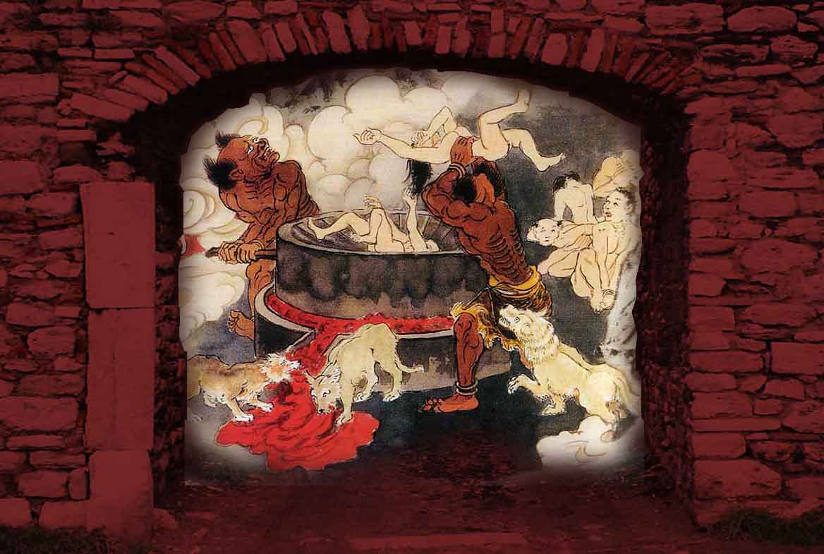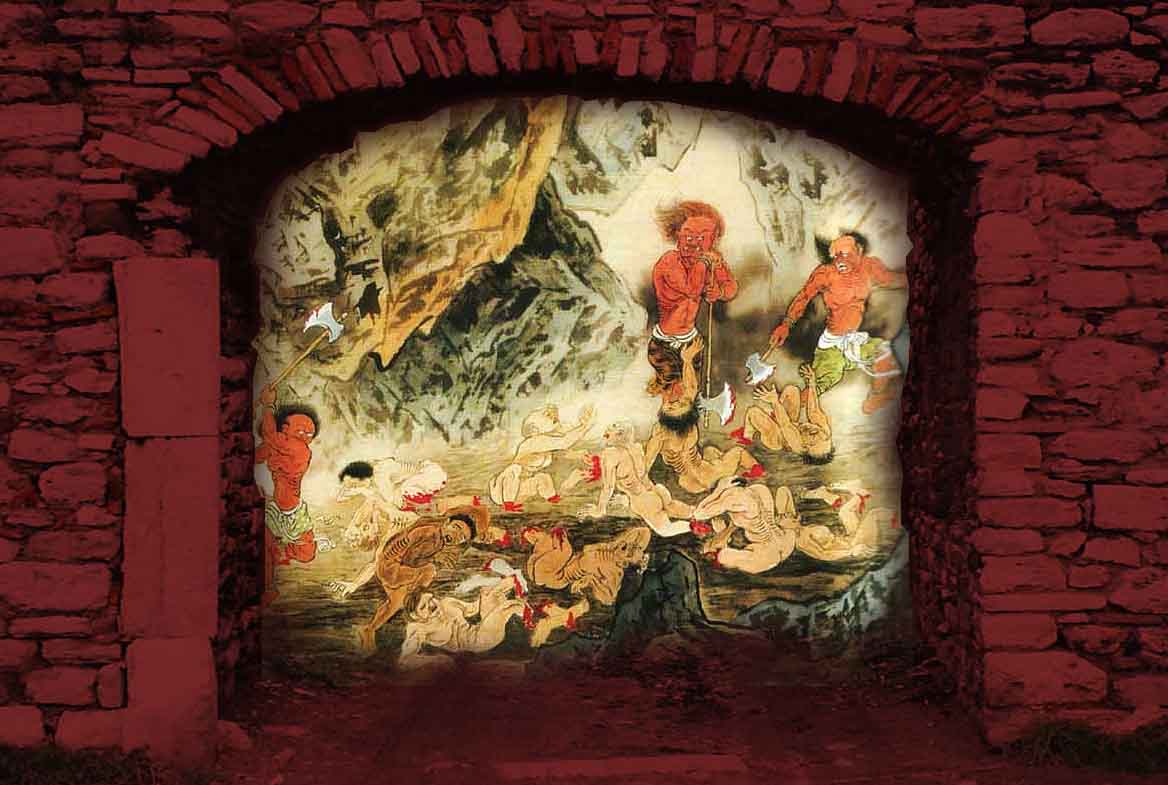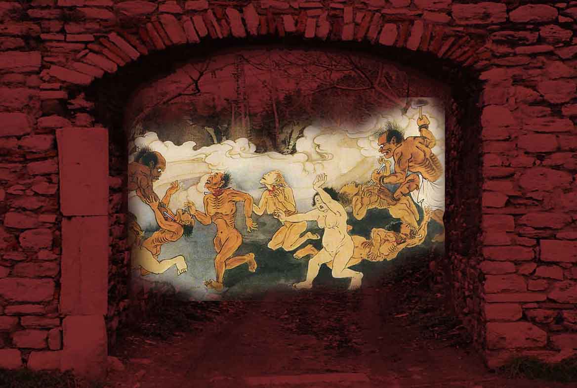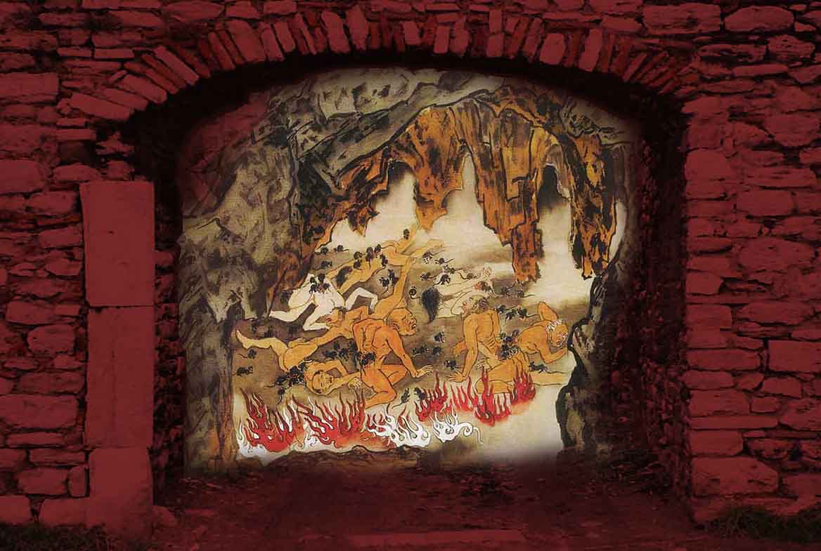 地獄之中,隨時可見成千上萬夜叉厲鬼,血口鋼牙,眼如電光,利爪如鋼鐵,箝制罪犯,押解拖曳至各大小地獄。