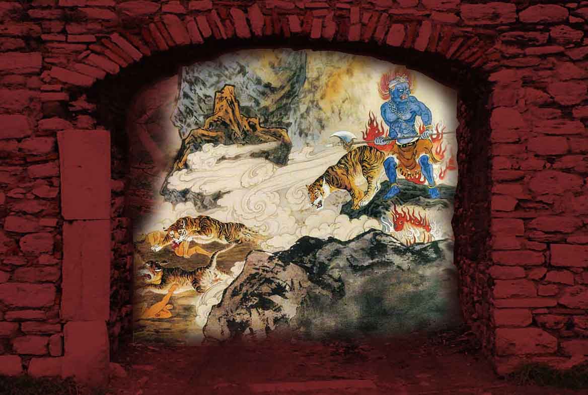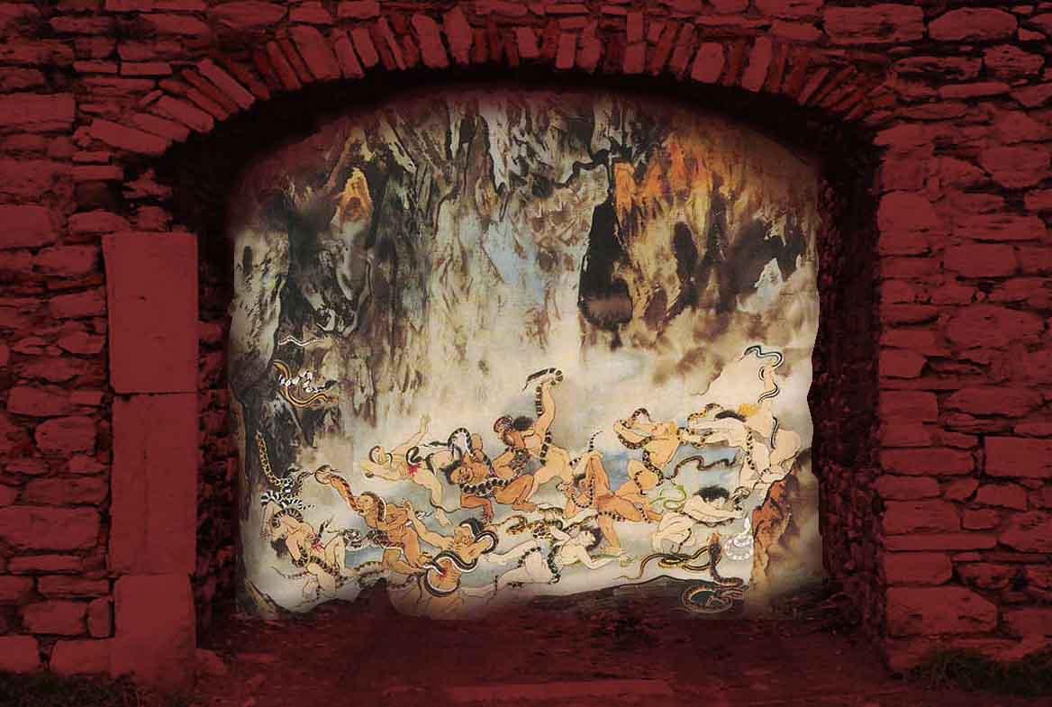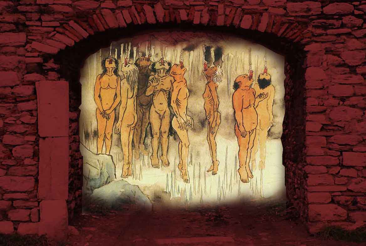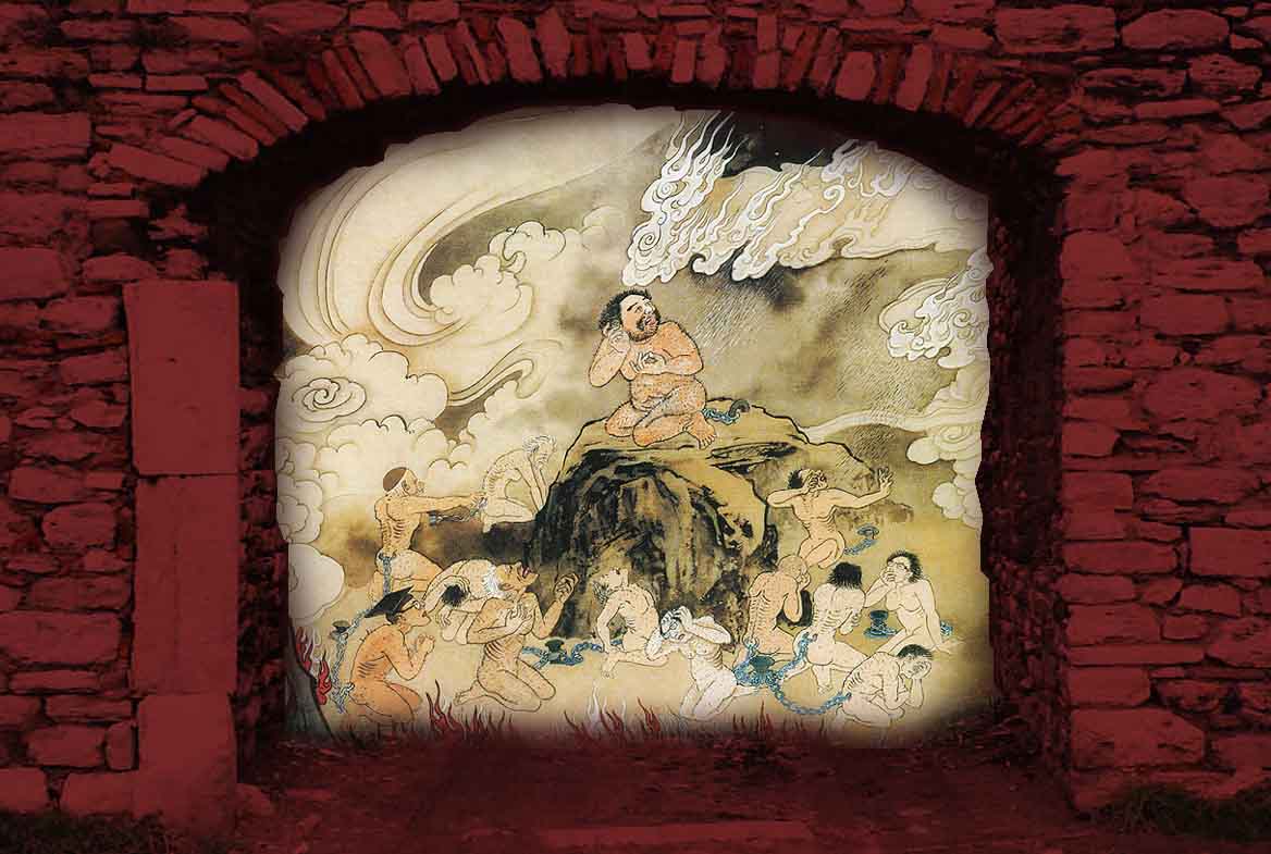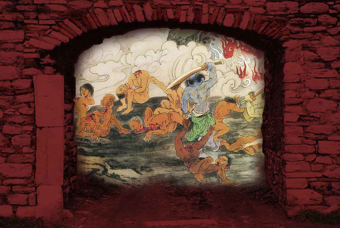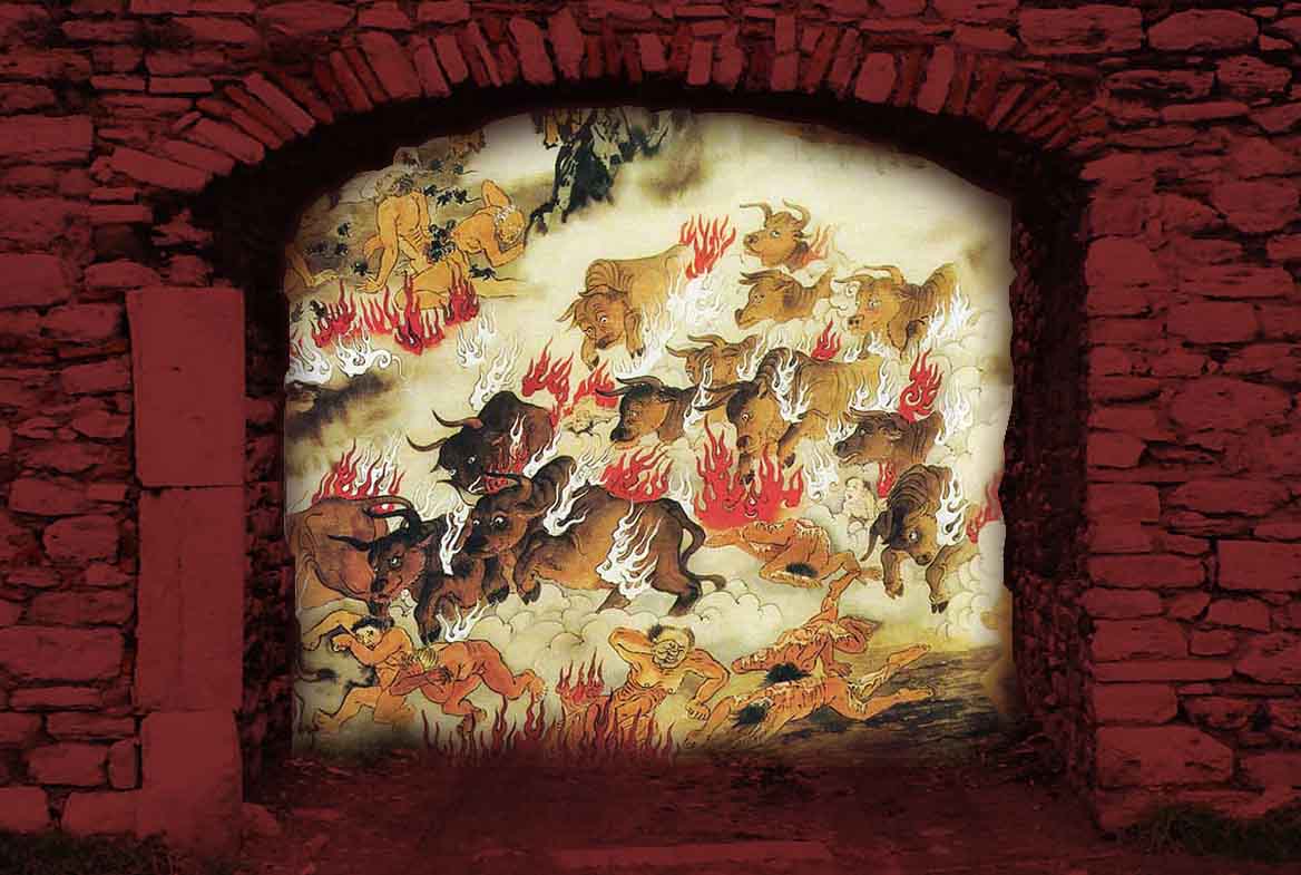 地獄之中,隨時可見成千上萬夜叉厲鬼,血口鋼牙,眼如電光,利爪如鋼鐵,箝制罪犯,押解拖曳至各大小地獄。