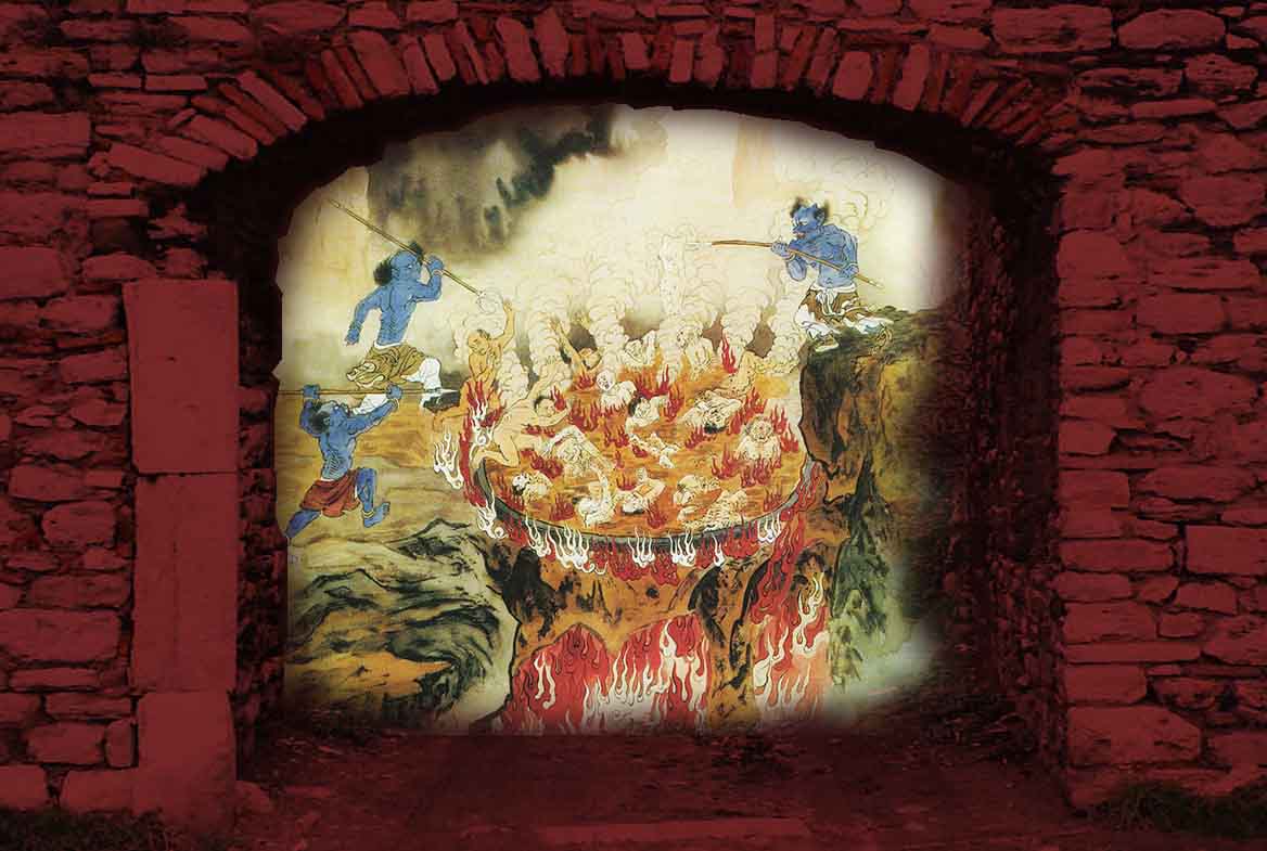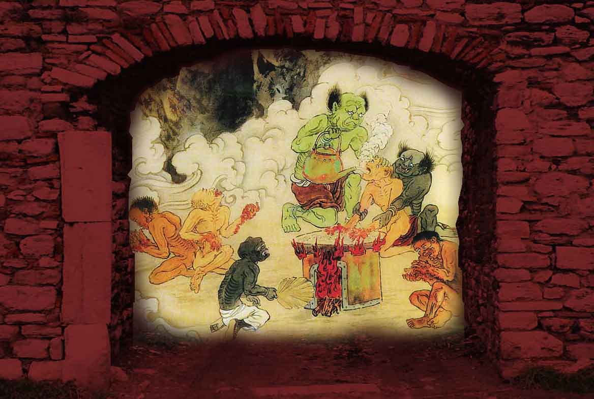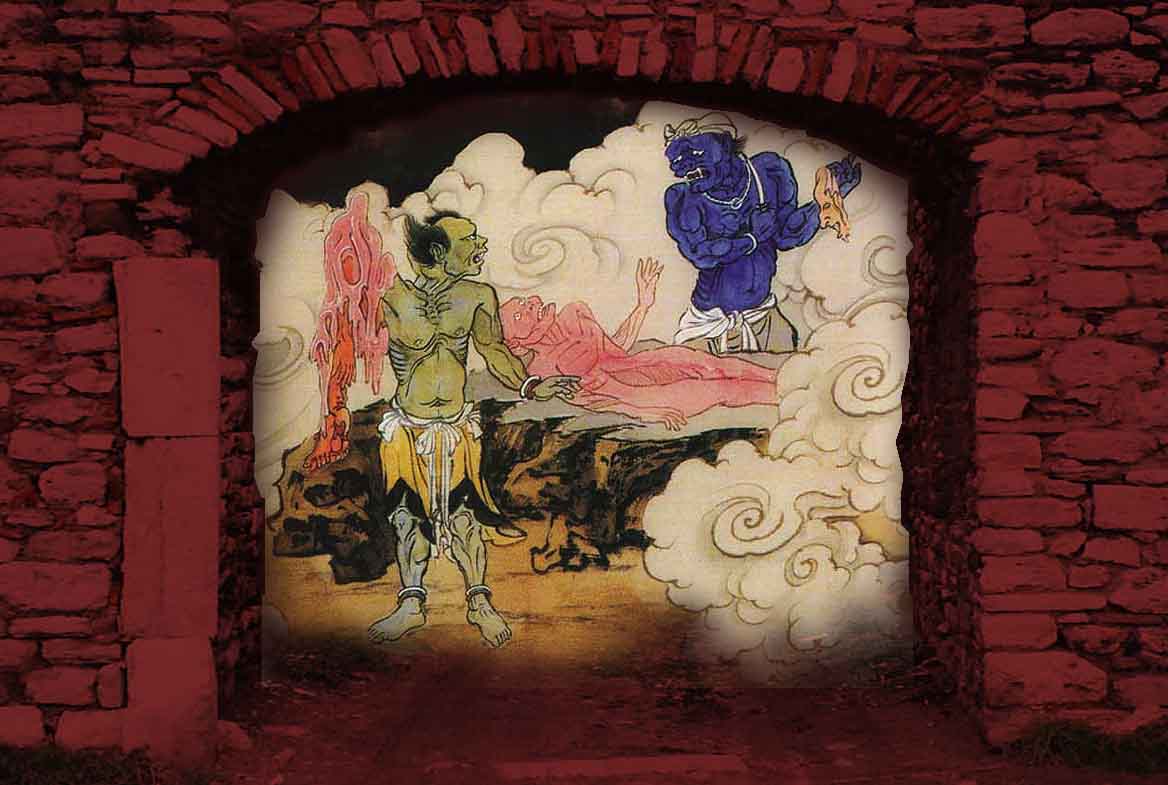飄過地獄門,巍巍鐵鑄的山巖峭壁,冒著終古不熄的赤燄,一望而無際。報到後的幽魂,不分貧富貴賤或男女老少,每人身邊都伴著一位猙獰可怖的厲鬼「隨從」,如影隨形;以鐵鍊套頸,牙棒摧身,拖拉前進。這些夜叉厲鬼,隨情緒而變色異形,或青、或綠,或人、或獸,十分恐怖。