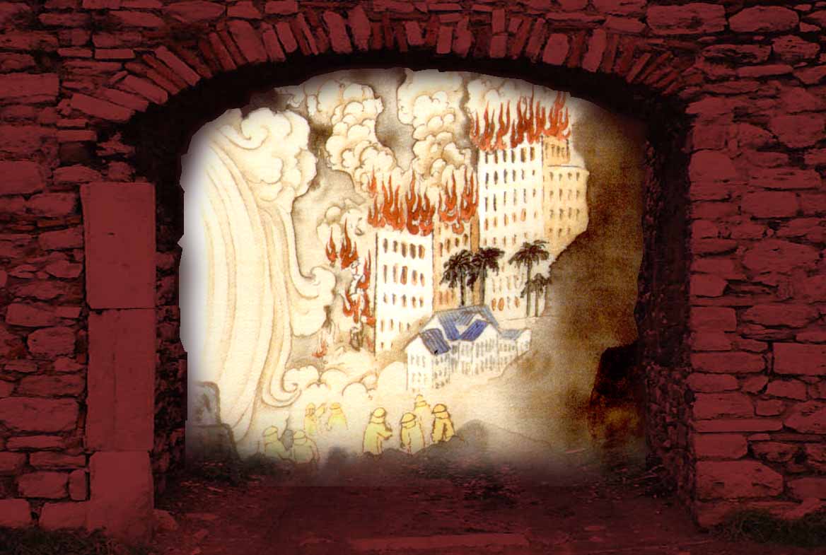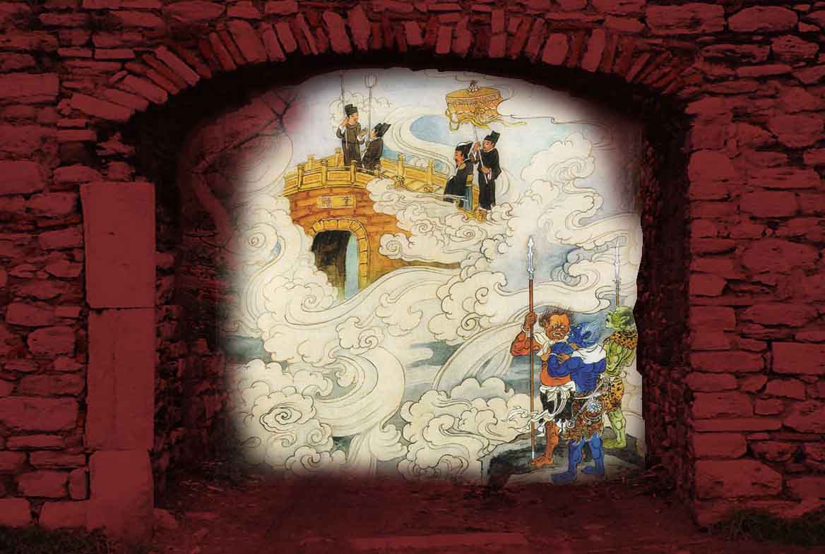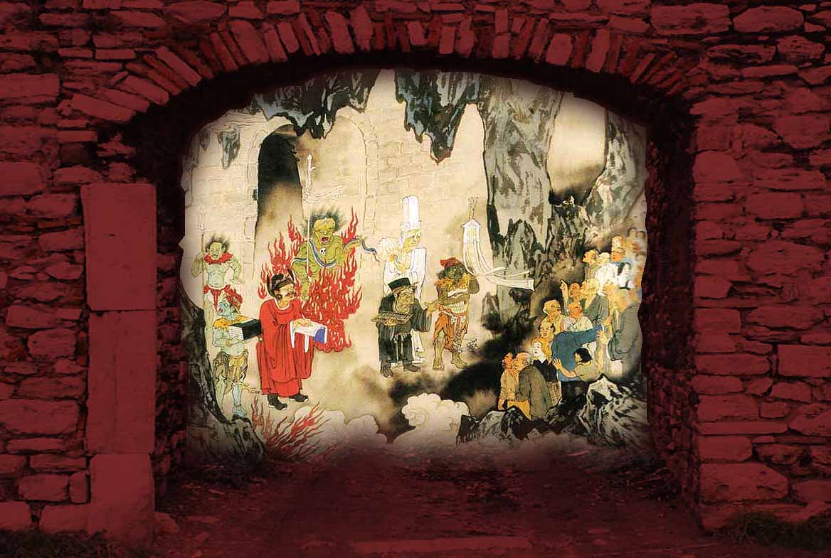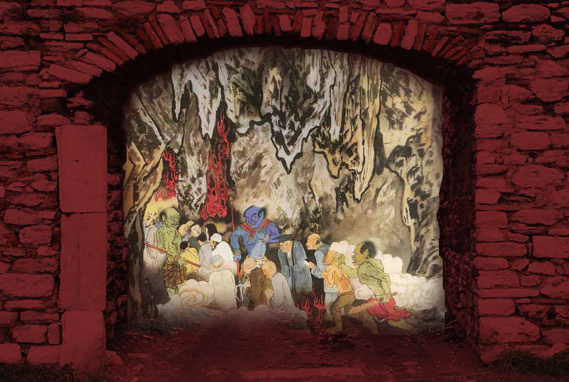 飄過地獄門,巍巍鐵鑄的山巖峭壁,冒著終古不熄的赤燄,一望而無際。報到後的幽魂,不分貧富貴賤或男女老少,每人身邊都伴著一位猙獰可怖的厲鬼「隨從」,如影隨形;以鐵鍊套頸,牙棒摧身,拖拉前進。這些夜叉厲鬼,隨情緒而變色異形,或青、或綠,或人、或獸,十分恐怖。