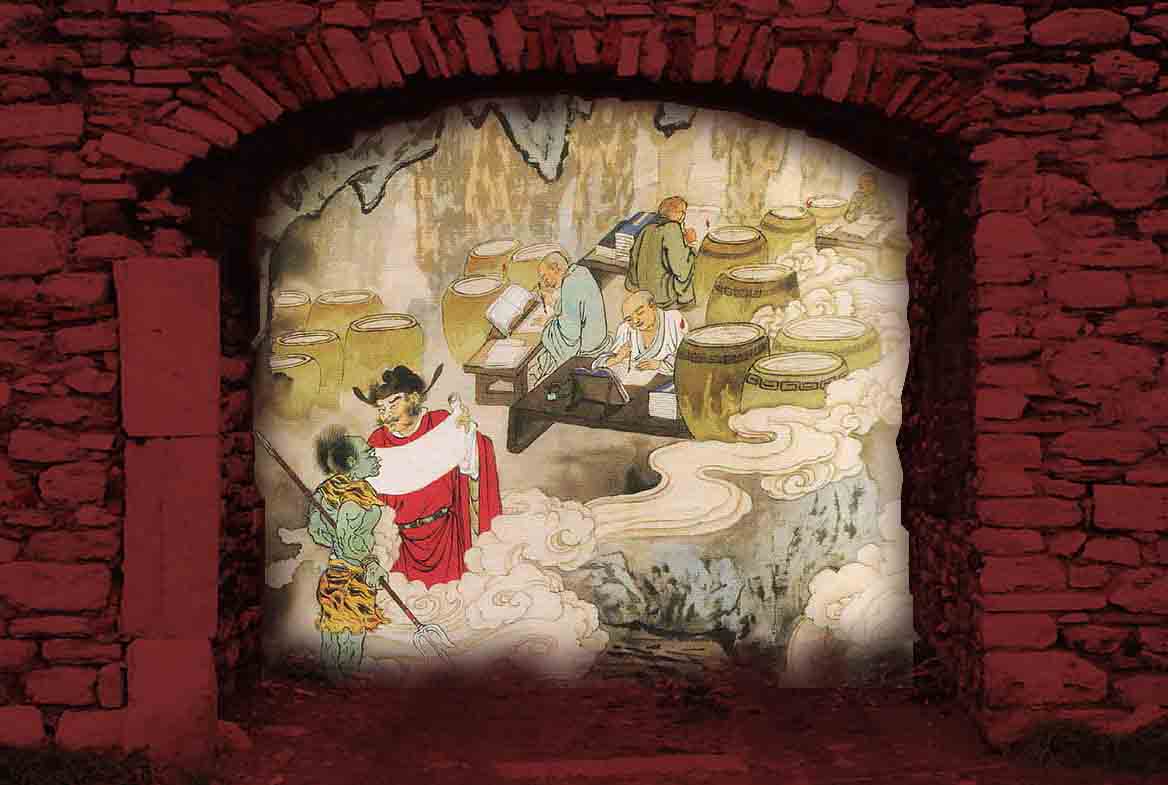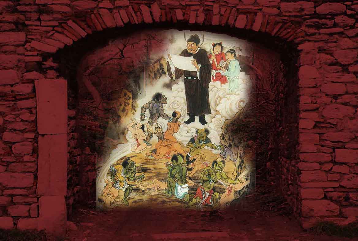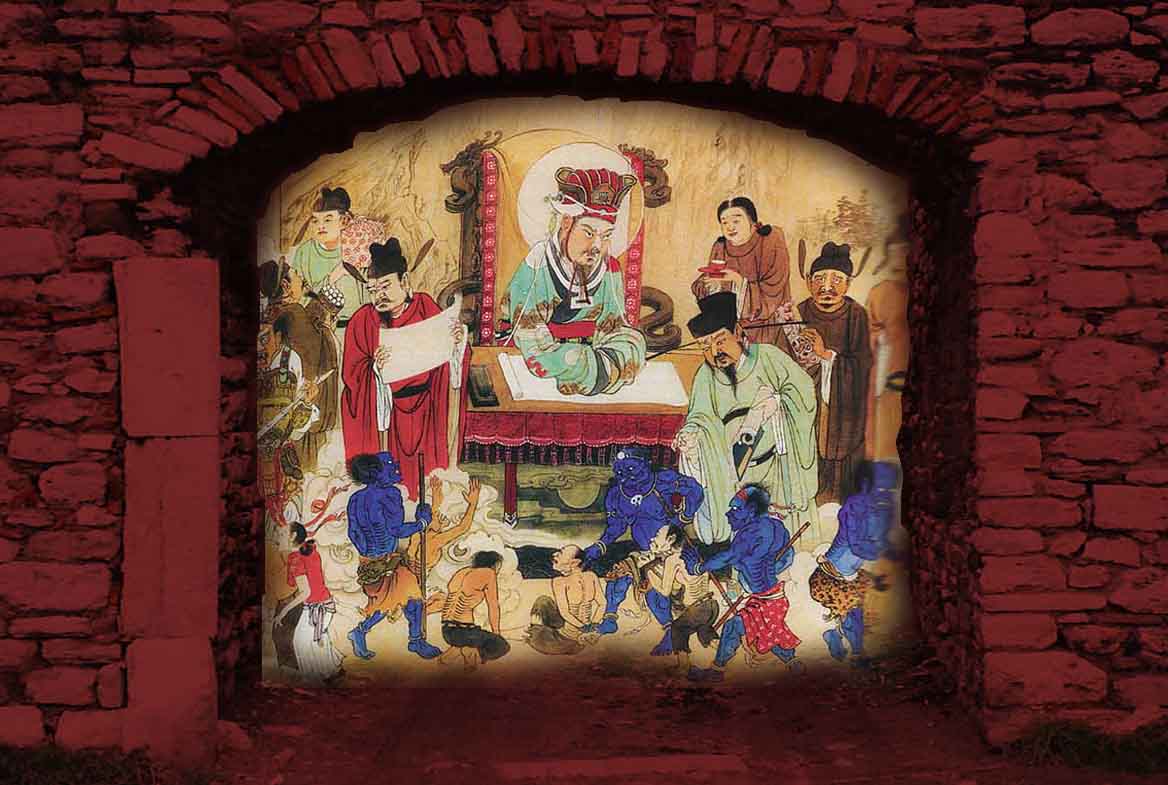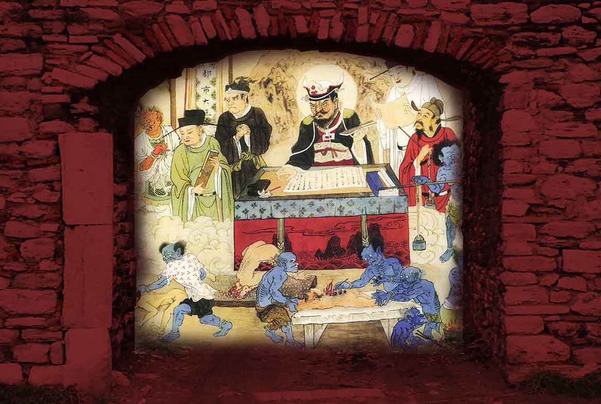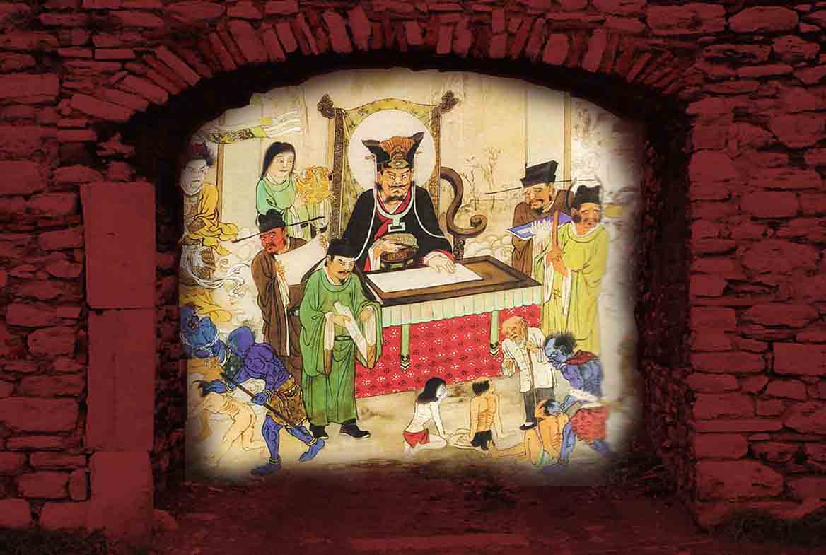 突然一聲霹靂般的吼道:「你又來了!」此時個個膽戰心驚,只見一位身高丈餘,渾身火焰,手執鋼叉、身纏鐵蛇、青面獠牙、猙獰可怖的鬼王吆喝著,原來前面已是地獄門,來相迎的正是黑白無常,以及判官鬼役。白無常搖著白羽扇;黑無常捧著鐵算盤,正所謂「一扇揮不去,老帳此時結。」紅袍判官手掀生死簿,口喝著前來報到的幽魂,雖然雙腿已軟,身子卻情不自禁的飄過地獄門。