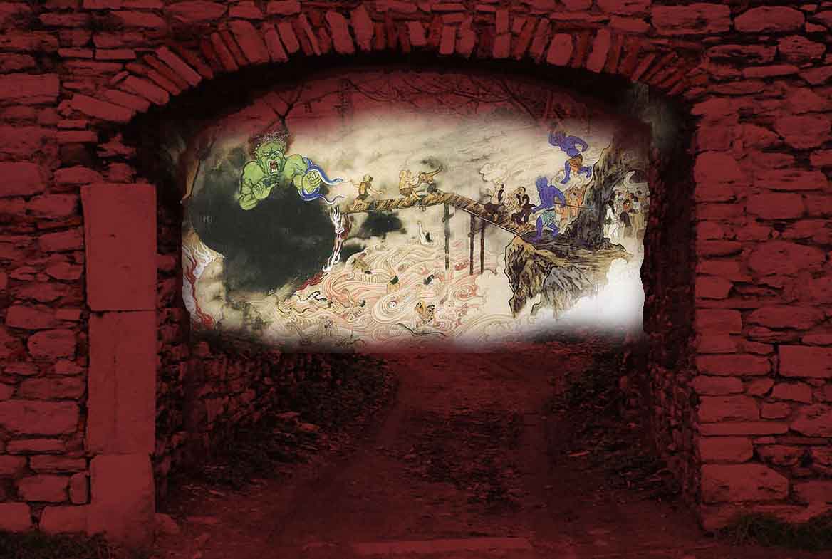 奈何橋是出入地獄「無奈之橋」,千年朽木架成,高達數百仞。橋上黑風淒厲無常侍候;橋下血河洶湧、毒蛇潛伏,亡魂躡過其上真是膽戰心驚,萬一墮入血河又是三途輪迴之身;嗚呼哀哉。