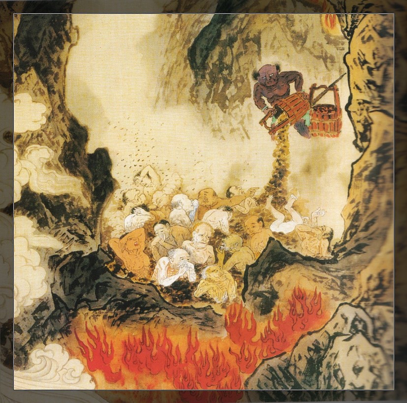 前有寒冰狱,此有火炼处。此处铁山万仞,四面环绕,周围数千里,一片火海,不毛之地,称之为:「饿鬼地狱。」堕此地狱罪魂,生前尽是悭贪吝啬之人,虽拥万贯资产,根据然滴水不舍。如今堕此地狱,落得骨瘦如柴,双目如铃,肚皮空大犹如泄气皮袋。这些罪魂,因贪而饥,因悭无福,_怒哀号而喷烈火,其状可怖,又称之:「焰口地狱。」即使大慈大悲观世音或地藏王菩萨,前来施食拯救,多因贪_无福,张口欲食,烈火已将食物烧烬,呼天抢地,又能奈何呢?