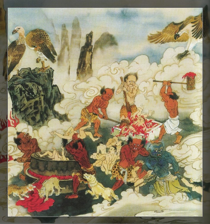 生前作屠杀业或捕鱼业,死后皆受此报。《立世经》云:此中罪人置于臼中,鬼卒以铁杵舂捣,血肉模糊,形如肉泥,其惨无比。